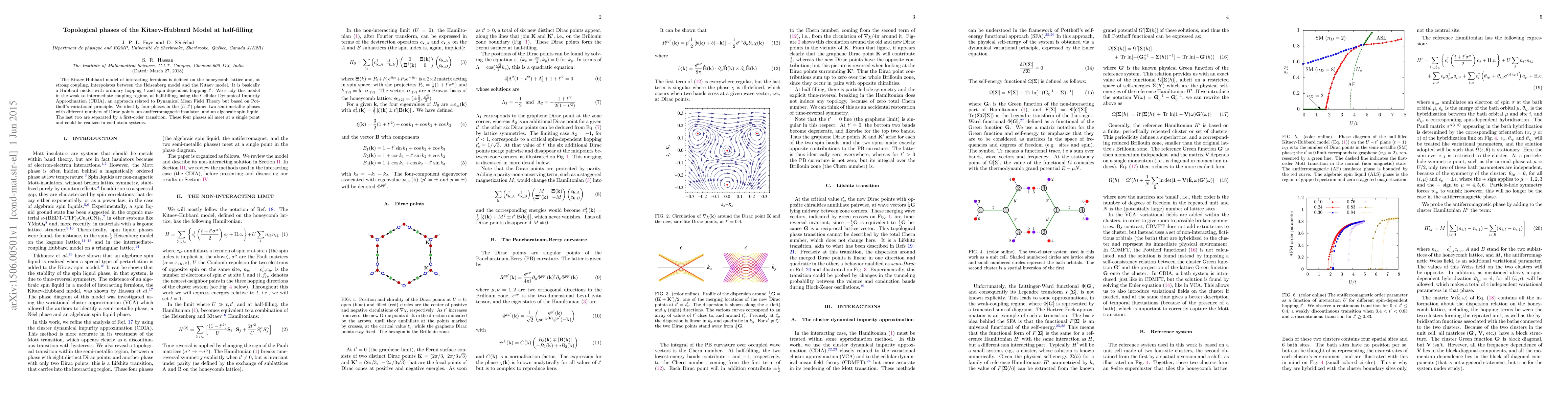The Kitaev-Hubbard model on the honeycomb lattice exhibits four topological phases at half-filling, identified using the Cellular Dynamical Impurity Approximation: two semi-metallic, an antiferromagnetic insulator, and an algebraic spin liquid, with the last two separated by a first-order transition. These phases converge at a single point and are feasible in cold atom systems.