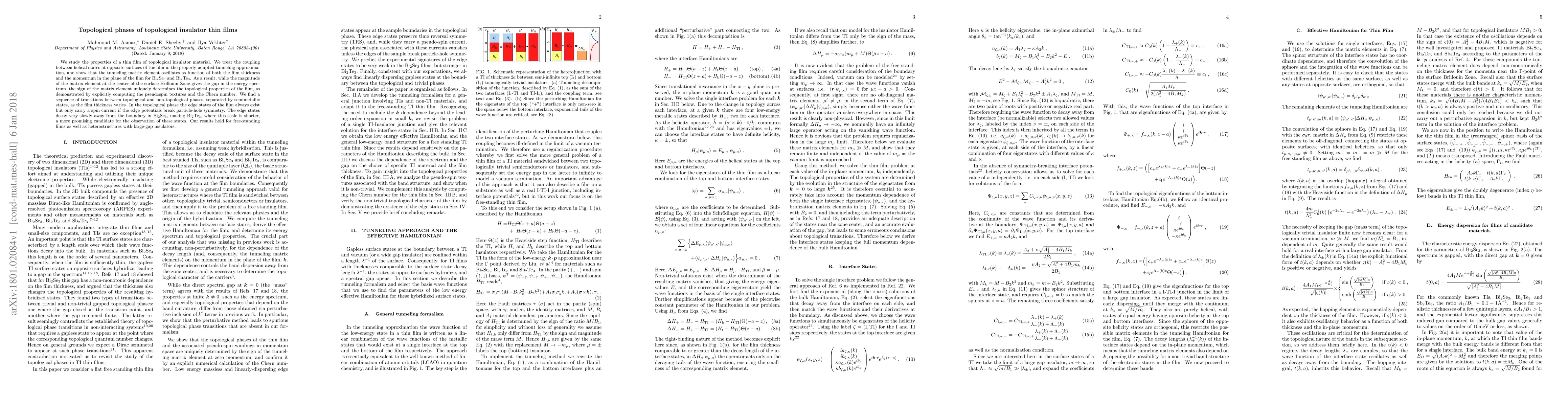 We study the properties of a thin film of topological insulator material. We treat the coupling between helical states at opposite surfaces of the film in the properly-adapted tunneling approximation, and show that the tunneling matrix element oscillates as function of both the film thickness and the momentum in the plane of the film for Bi$_2$Se$_3$ and Bi$_2$Te$_3$. As a result, while the magnitude of the matrix element at the center of the surface Brillouin Zone gives the gap in the energy spectrum, the sign of the matrix element uniquely determines the topological properties of the film, as demonstrated by explicitly computing the pseudospin textures and the Chern number. We find a sequence of transitions between topological and non-topological phases, separated by semimetallic states, as the film thickness varies. In the topological phase the edge states of the film always exist but only carry a spin current if the edge potentials break particle-hole symmetry. The edge states decay very slowly away from the boundary in Bi$_2$Se$_3$, making Bi$_{2}$Te$_{3}$, where this scale is shorter, a more promising candidate for the observation of these states. Our results hold for free-standing films as well as heterostructures with large-gap insulators.