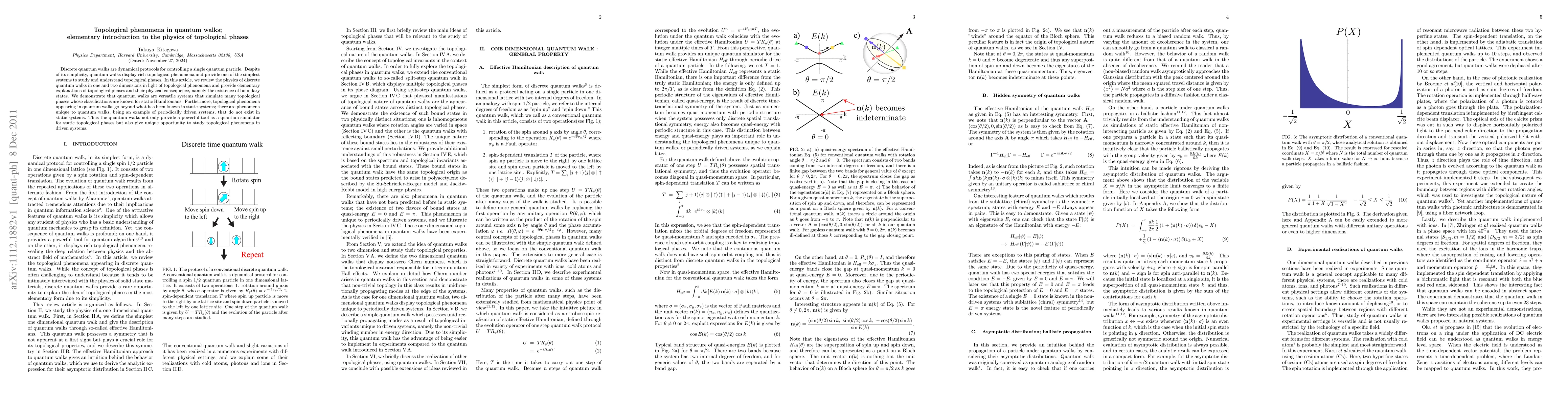 This paper reviews the topological phenomena in discrete quantum walks, highlighting their simplicity in simulating complex topological phases. It introduces elementary explanations of topological phases and the existence of boundary states, showing that quantum walks uniquely demonstrate phenomena not present in static systems, thus offering a powerful tool for studying driven topological phenomena.