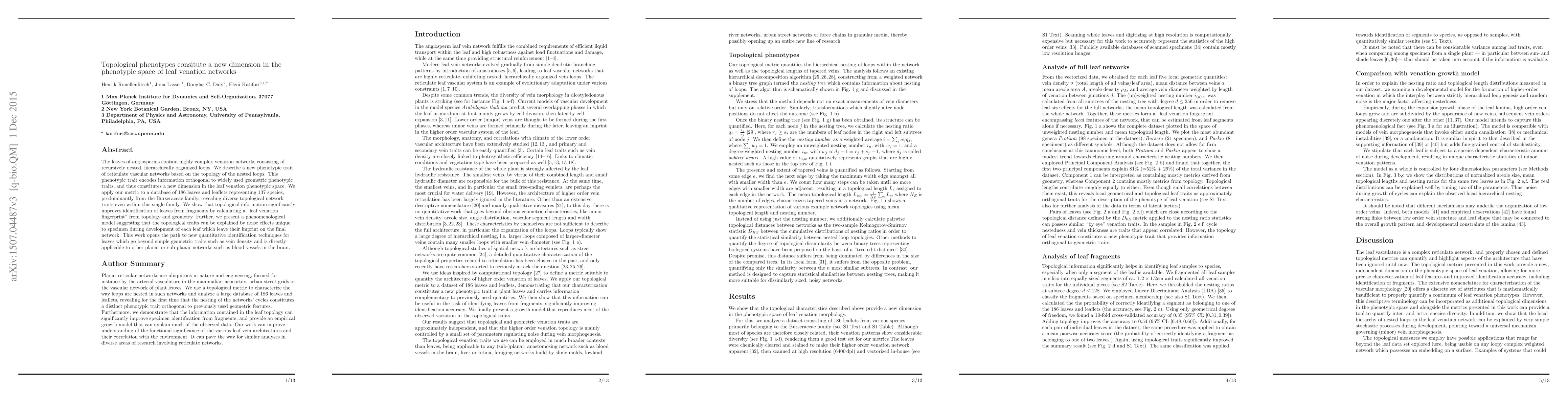 This paper introduces a new topological phenotypic trait for leaf venation networks, providing a new dimension in leaf venation phenotypic space. It demonstrates that topological information significantly enhances leaf identification and suggests a model explaining these traits as noise effects during development.