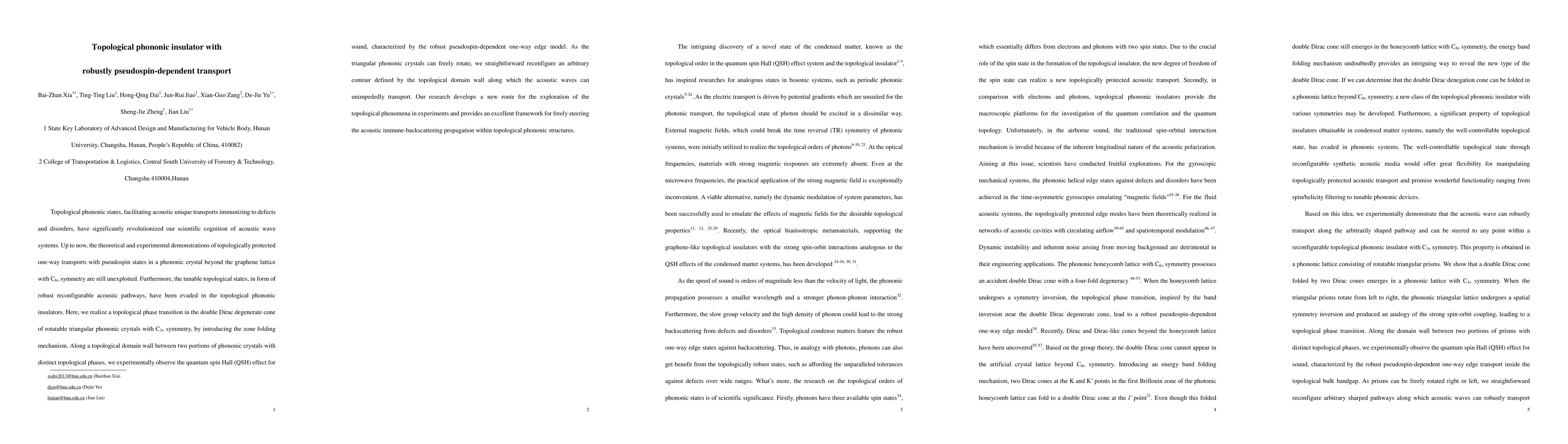 This research demonstrates a topological phononic insulator in rotatable triangular phononic crystals with C3v symmetry, exhibiting robust pseudospin-dependent one-way transport. The study achieves a topological phase transition via zone folding, observing the quantum spin Hall effect for sound and enabling reconfigurable acoustic pathways.