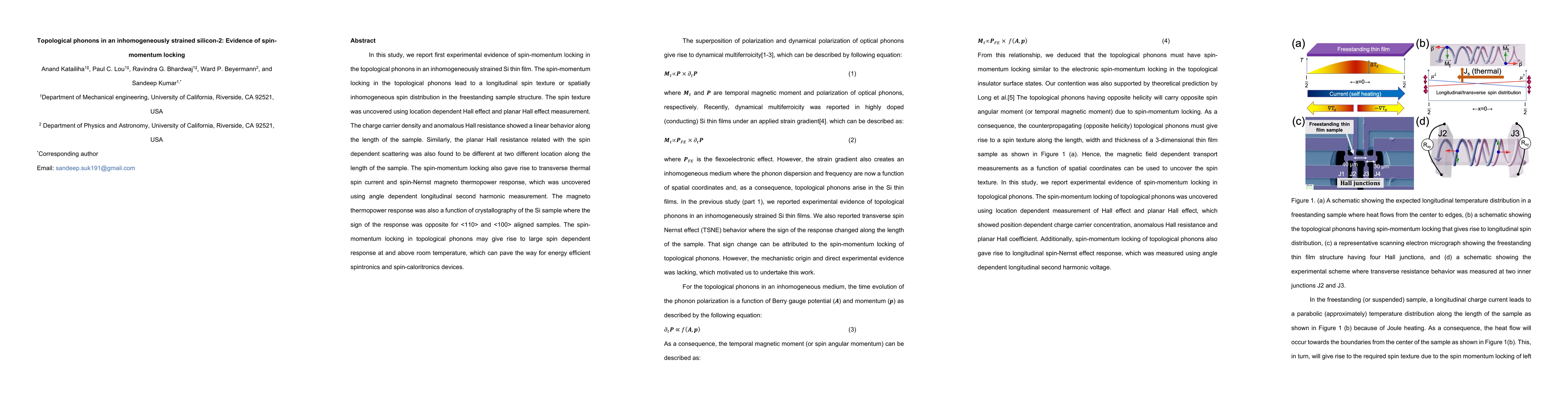 This study provides the first experimental evidence of spin-momentum locking in topological phonons within an inhomogeneously strained silicon thin film, revealing a longitudinal spin texture and transverse thermal spin current. The findings suggest potential for energy-efficient spintronics and spin-caloritronics devices at room temperature.