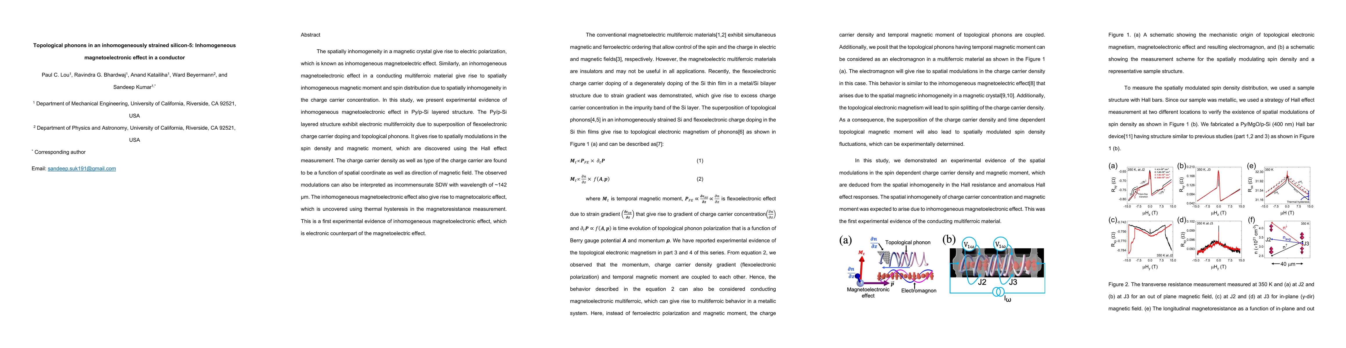 This paper presents experimental evidence of the inhomogeneous magnetoelectronic effect in Py/p-Si layered structures, revealing spatially modulated spin density and magnetic moment due to flexoelectronic charge carrier doping and topological phonons. The study uncovers magnetocaloric effects and provides the first experimental observation of this electronic counterpart of the magnetoelectric effect.