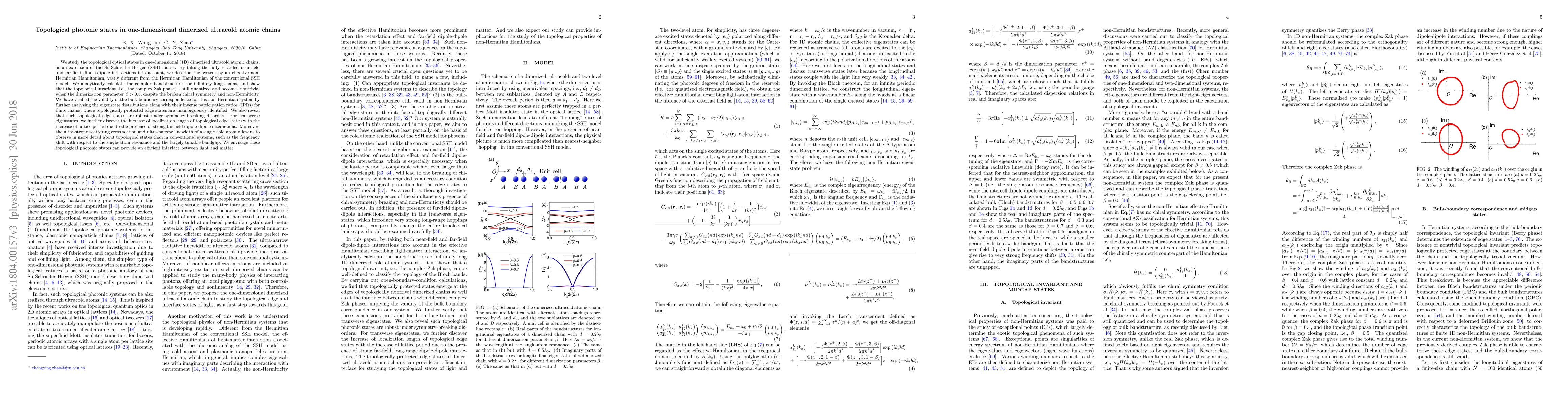 This paper investigates topological optical states in one-dimensional dimerized ultracold atomic chains, extending the SSH model with non-Hermitian Hamiltonians. It reveals nontrivial complex Zak phase and topologically protected edge states, which remain robust under symmetry-breaking disorders, and highlights the potential for efficient light-matter interfaces.