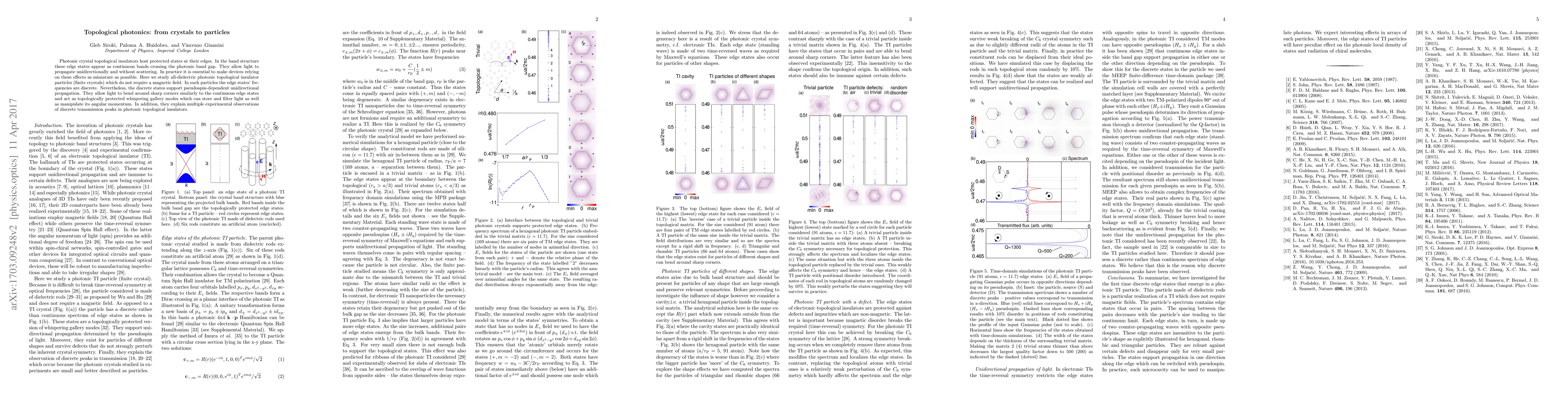 Photonic crystal topological insulators host protected states at their edges. In the band structure these edge states appear as continuous bands crossing the photonic band gap. They allow light to propagate unidirectionally and without scattering. In practice it is essential to make devices relying on these effects as miniature as possible. Here we study all-dielectric photonic topological insulator particles (finite crystals) which do not require a magnetic field. In such particles the edge states' frequencies are discrete. Nevertheless, the discrete states support pseudospin-dependent unidirectional propagation. They allow light to bend around sharp corners similarly to the continuous edge states and act as topologically protected whispering gallery modes which can store and filter light as well as manipulate its angular momentum. In addition, they explain multiple experimental observations of discrete transmission peaks in photonic topological insulators.