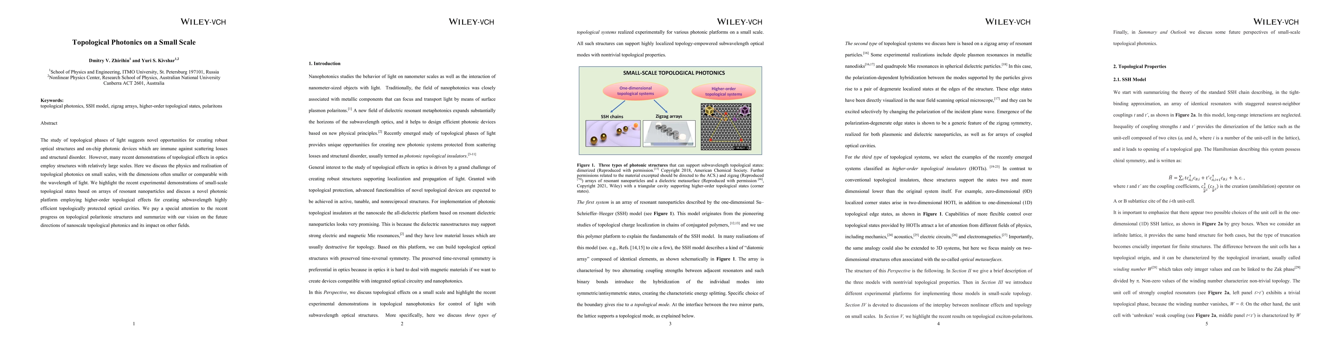This paper explores the physics and realization of topological photonics on small scales, focusing on nanoscale structures that leverage higher-order topological effects to create robust optical devices immune to scattering losses. It highlights recent experimental demonstrations using resonant nanoparticles and discusses future directions for nanoscale topological photonics.