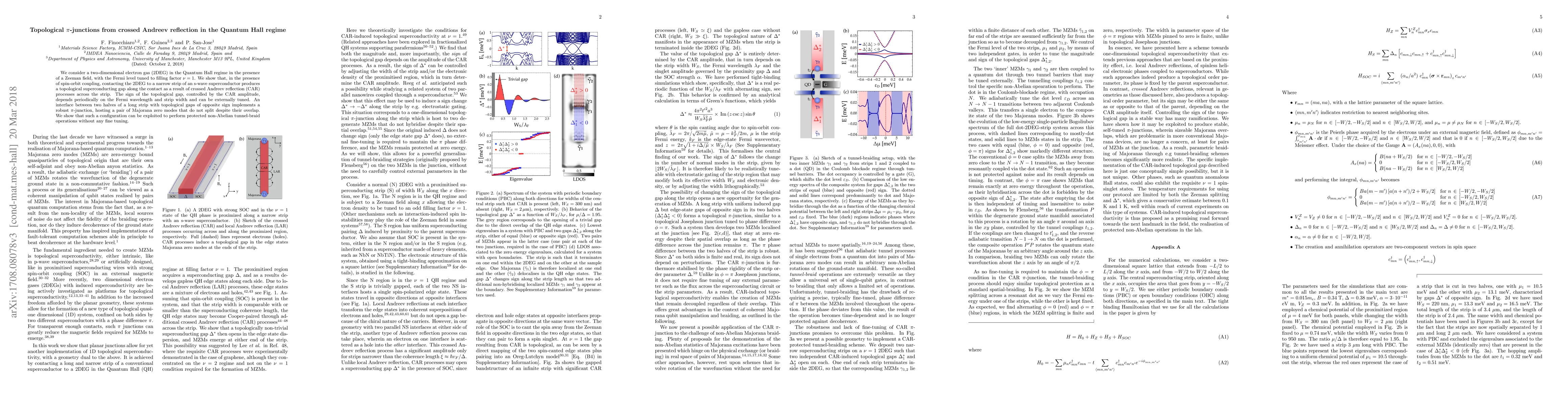 We consider a two-dimensional electron gas (2DEG) in the Quantum Hall regime in the presence of a Zeeman field, with the Fermi level tuned to filling factor $\nu=1$. We show that, in the presence of spin-orbit coupling, contacting the 2DEG to a narrow strip of an s-wave superconductor produces a topological superconducting gap along the contact as a result of crossed Andreev reflection (CAR) processes across the strip. The sign of the topological gap, controlled by the CAR amplitude, depends periodically on the Fermi wavelength and strip width and can be externally tuned. An interface between two halves of a long strip with topological gaps of opposite sign implements a robust $\pi$-junction, hosting a pair of Majorana zero modes that do not split despite their overlap. We show that such a situation can be exploited to perform protected non-Abelian tunnel-braid operations without any fine tuning.
