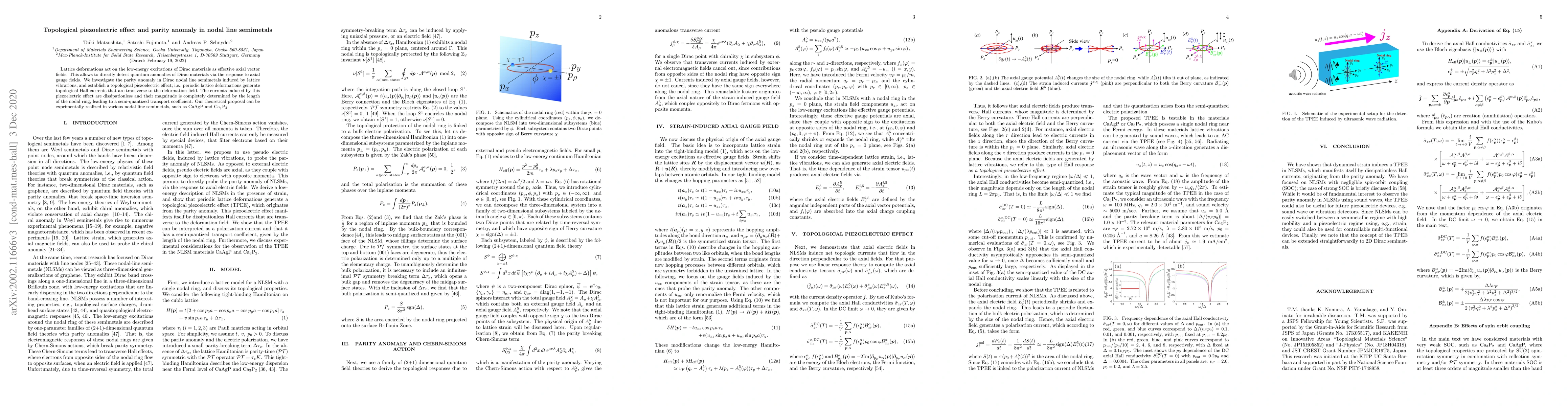 This paper investigates the topological piezoelectric effect and parity anomaly in Dirac nodal line semimetals, showing how lattice deformations induce topological Hall currents that are transverse to the deformation field. The effect leads to dissipationless, semi-quantized transport currents, which can be experimentally realized in materials like CaAgP and Ca$_{_3}$P$_{_2}$.