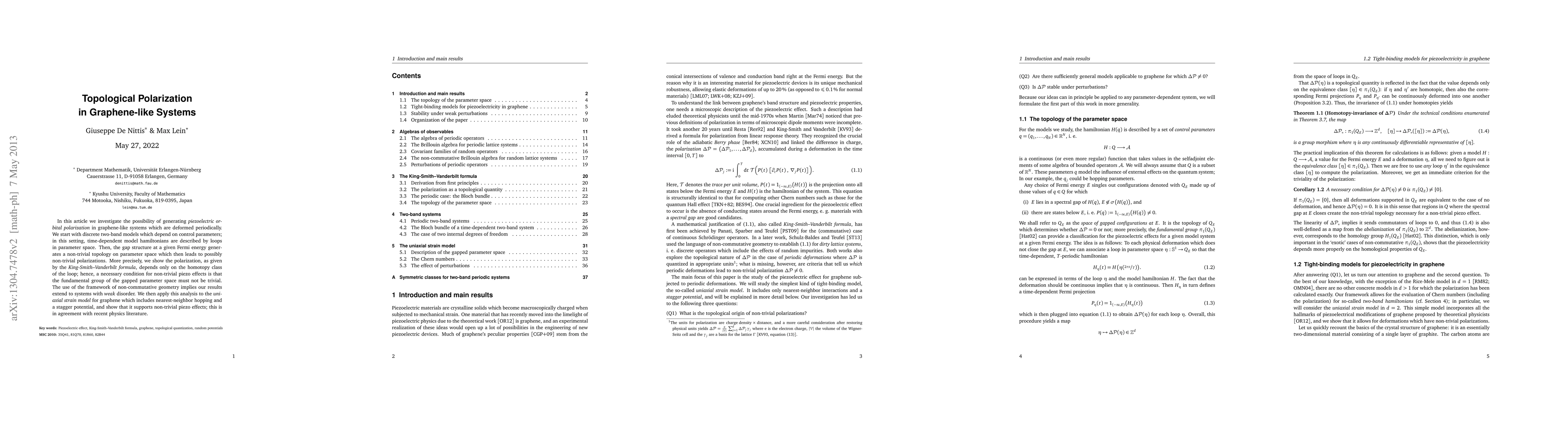 Researchers explore piezoelectric properties in graphene-like systems under periodic deformation, finding a condition for non-trivial polarization based on the fundamental group of parameter space.
