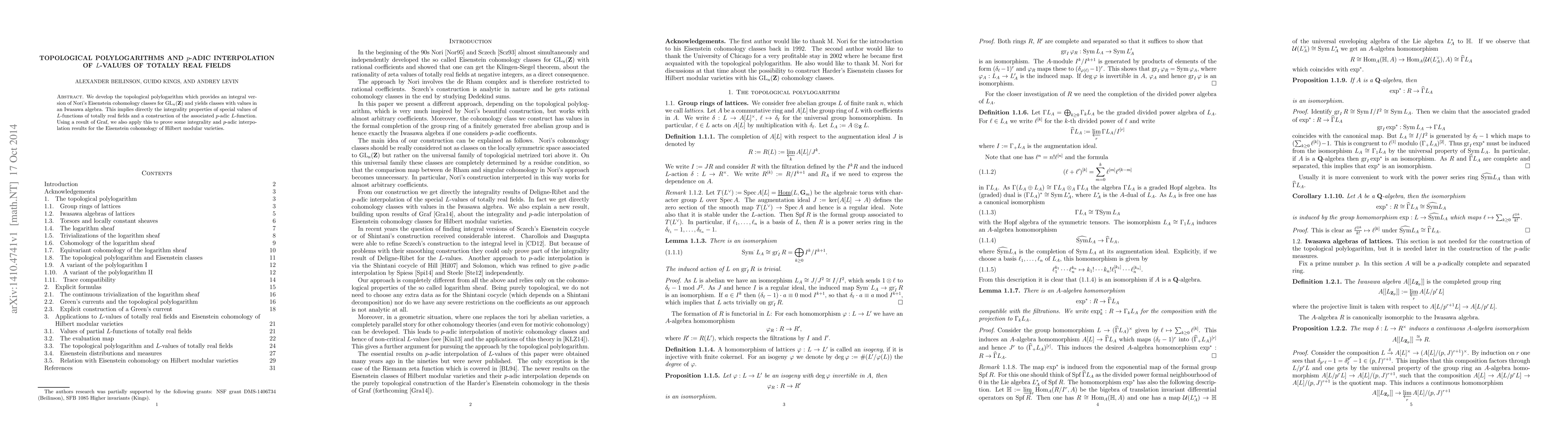 This paper introduces a topological polylogarithm, linking Nori's Eisenstein cohomology classes for $GL_n(\mathbf{Z})$ with Iwasawa algebra values, which demonstrates the integrality of $L$-function values for totally real fields and constructs a $p$-adic $L$-function, extending these results to Hilbert modular varieties.
