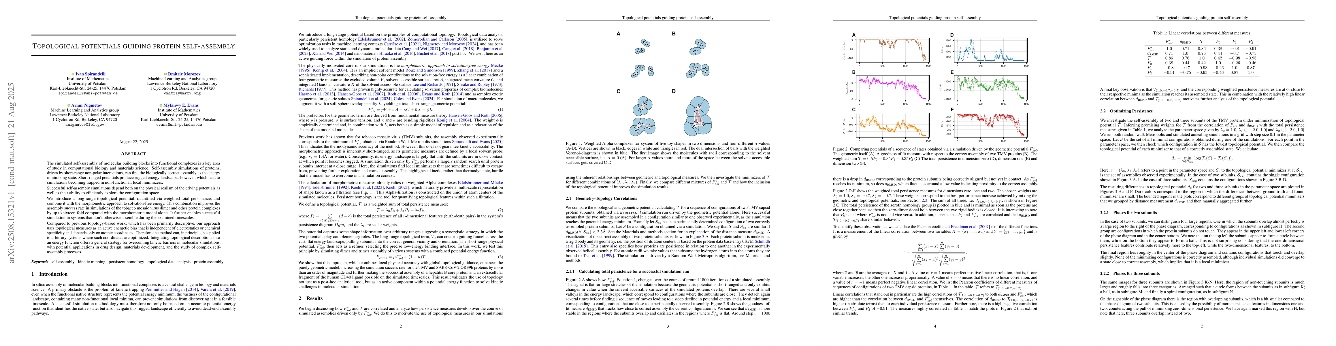 The simulated self-assembly of molecular building blocks into functional complexes is a key area of study in computational biology and materials science. Self-assembly simulations of proteins, driven by short-range non-polar interactions, can find the biologically correct assembly as the energy minimizing state. Short-ranged potentials produce rugged energy landscapes however, which lead to simulations becoming trapped in non-functional, local minimizers. Successful self-assembly simulations depend both on the physical realism of the driving potentials as well as their ability to efficiently explore the configuration space. We introduce a long-range topological potential, quantified via weighted total persistence, and combine it with the morphometric approach to solvation-free energy. This combination improves the assembly success rate in simulations of the tobacco mosaic virus dimer and other protein complexes by up to sixteen-fold compared with the morphometric model alone. It further enables successful simulation in systems that don't otherwise assemble during the examined timescales. Compared to previous topology-based work, which has been primarily descriptive, our approach uses topological measures as an active energetic bias that is independent of electrostatics or chemical specificity and depends only on atomic coordinates. Therefore the method can, in principle, be applied to arbitrary systems where such coordinates are optimized. Integrating topological descriptions into an energy function offers a general strategy for overcoming kinetic barriers in molecular simulations, with potential applications in drug design, materials development, and the study of complex self-assembly processes.