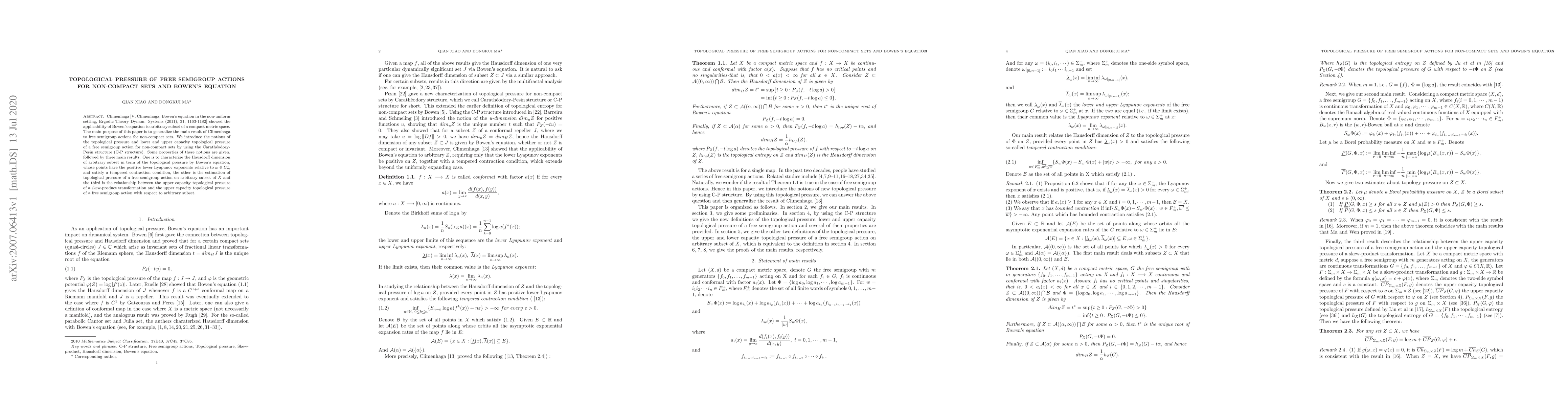 This paper generalizes Climenhaga's results on Bowen's equation to free semigroup actions for non-compact sets, introducing topological pressure and capacity notions. The main findings include characterizing Hausdorff dimension via topological pressure, estimating pressure for free semigroup actions, and linking upper capacity pressures in skew-product and free semigroup contexts.