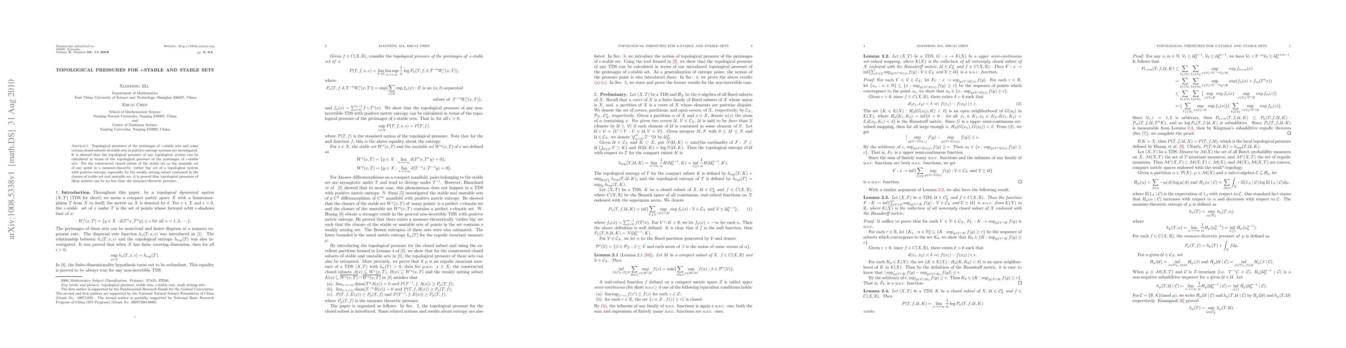 Topological pressures of the preimages of $\epsilon$-stable sets and some certain closed subsets of stable sets in positive entropy systems are investigated. It is showed that the topological pressure of any topological system can be calculated in terms of the topological pressure of the preimages of $\epsilon$-stable sets. For the constructed closed subset of the stable set or the unstable set of any point in a measure-theoretic `rather big' set of a topological system with positive entropy, especially for the weakly mixing subset contained in the closure of stable set and unstable set, it is proved that topological pressures of these subsets can be no less than the measure-theoretic pressure.