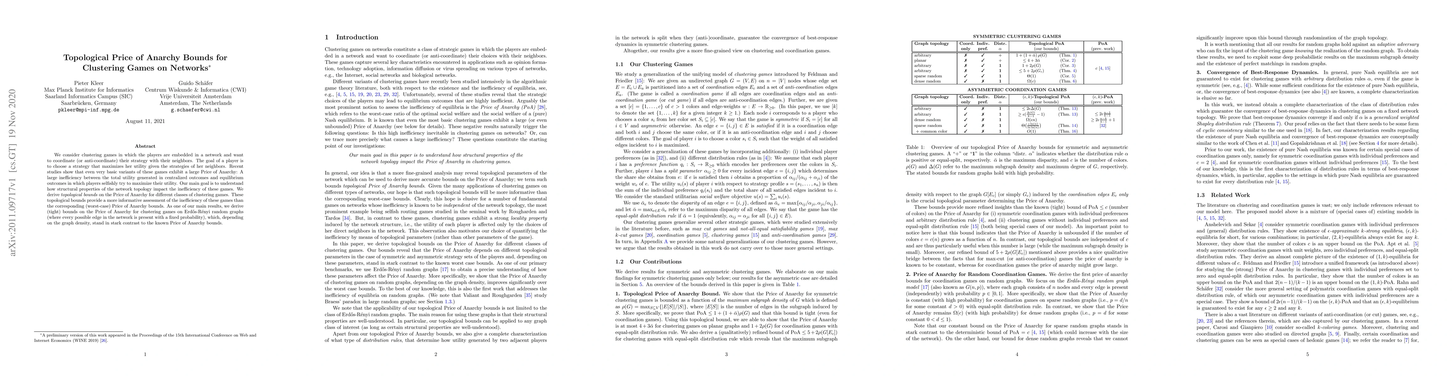 This paper investigates clustering games on networks, focusing on the inefficiency between centralized and equilibrium outcomes, termed the Price of Anarchy. It derives topological bounds on this inefficiency, providing a more nuanced understanding than traditional worst-case bounds, especially for clustering games on Erdős-Rényi random graphs.