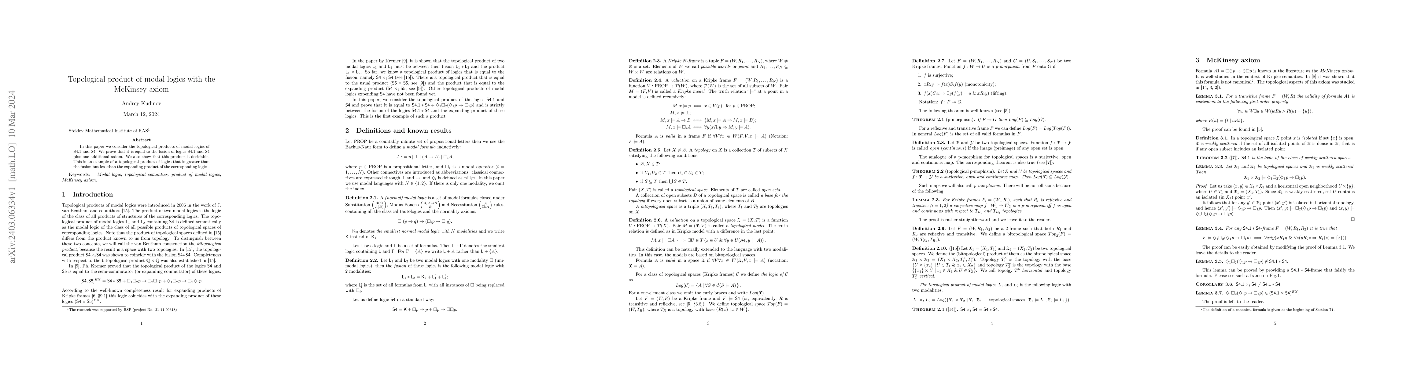 The paper demonstrates that the topological product of modal logics S4.1 and S4 is equivalent to the fusion of these logics plus an additional axiom, and proves its decidability. This illustrates a case where the product logic is greater than the fusion but less than the expanding product.
