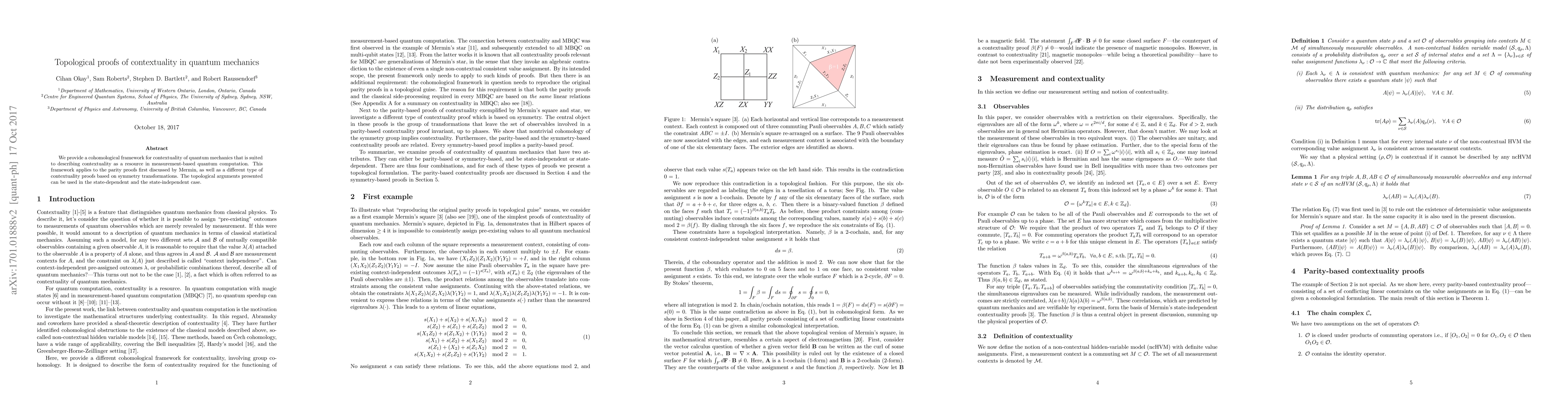 This paper introduces a cohomological framework for contextuality in quantum mechanics, applicable to both parity and symmetry-based proofs, aiding in measurement-based quantum computation and addressing both state-dependent and state-independent contextuality through topological arguments.