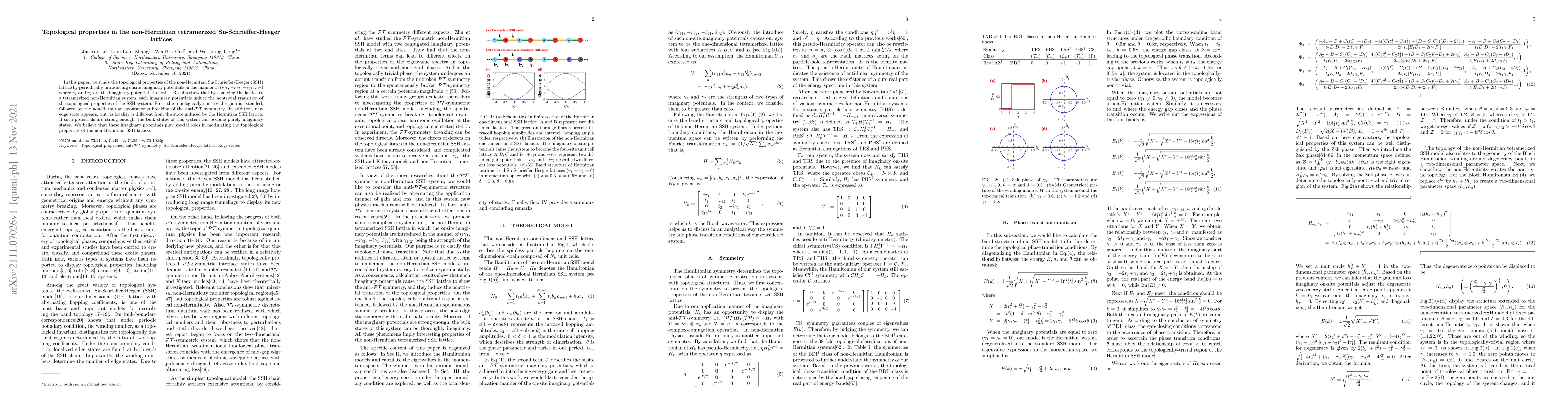 In this paper, we study the topological properties of the non-Hermitian Su-Schrieffer-Heeger (SSH) lattice by periodically introducing onsite imaginary potentials in the manner of ($i\gamma_1$, $-i\gamma_2$, $-i\gamma_1$, $i\gamma_2$) where $\gamma_1$ and $\gamma_2$ are the imaginary potential strengths. Results show that by changing the lattice to a tetramerized non-Hermitian system, such imaginary potentials induce the nontrivial transition of the topological properties of the SSH system. First, the topologically-nontrivial region is extended, followed by the non-Hermitian spontaneous breaking of the anti-$\cal PT$ symmetry. In addition, new edge state appears, but its locality is different from the state induced by the Hermitian SSH lattice. If such potentials are strong enough, the bulk states of this system can become purely imaginary states. We believe that these imaginary potentials play special roles in modulating the topological properties of the non-Hermitian SSH lattice.