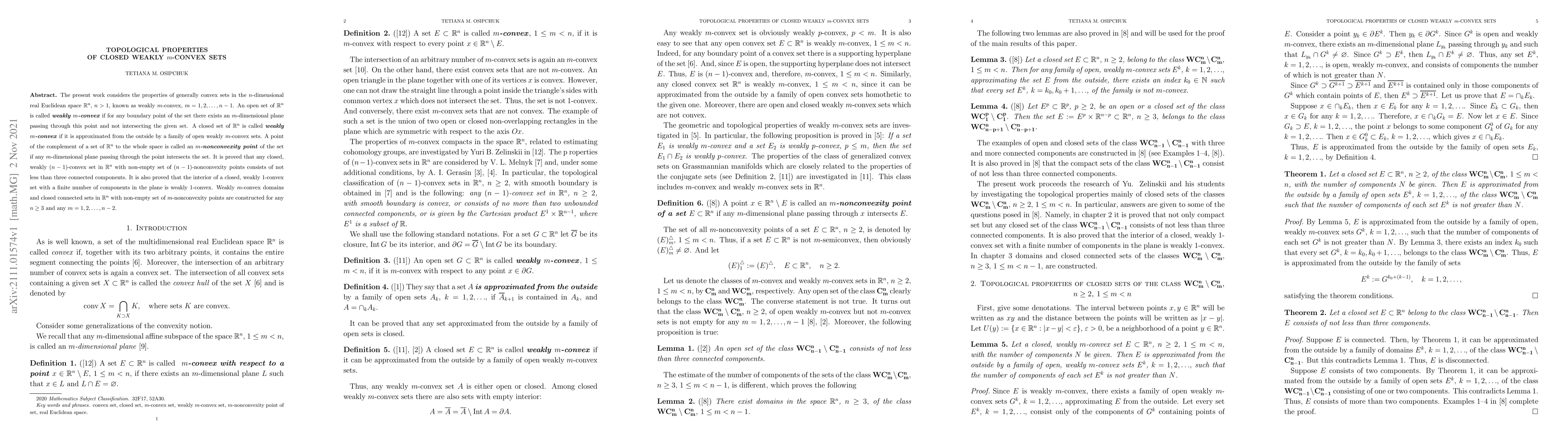 This paper investigates topological properties of closed weakly $m$-convex sets in $\mathbb{R}^n$, proving that any closed, weakly $(n-1)$-convex set with non-empty $(n-1)$-nonconvexity points has at least three connected components. It also demonstrates that the interior of a closed, weakly $1$-convex set in the plane is weakly $1$-convex.
