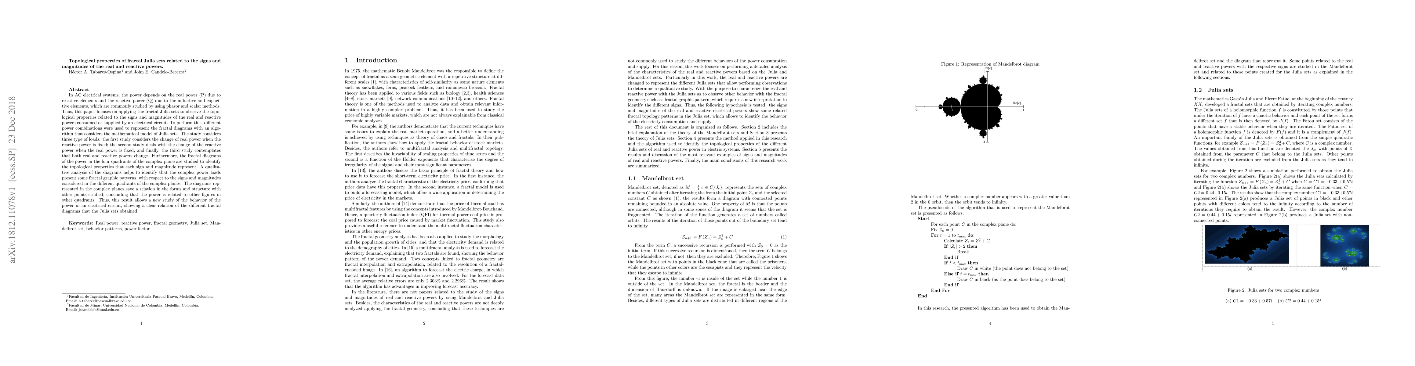 This paper applies fractal Julia sets to analyze the topological properties of electrical power systems, focusing on the signs and magnitudes of real and reactive powers. It uses fractal diagrams to study the behavior of power under different load conditions, revealing complex, fractal patterns that relate to the power's distribution across the complex plane.