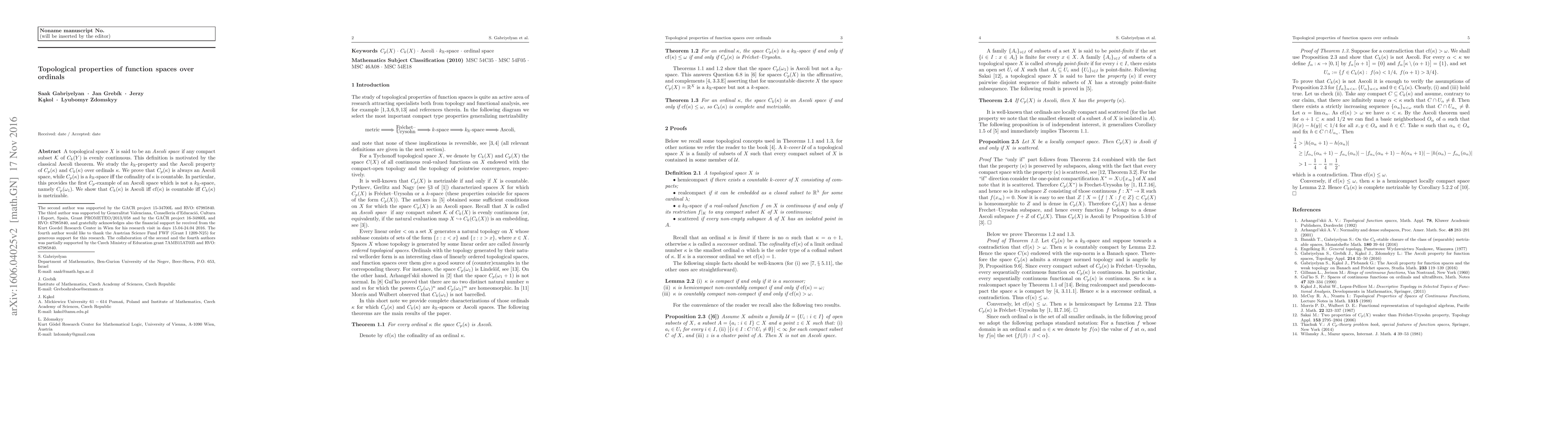 This paper explores the topological properties of function spaces over ordinals, proving that $C_p(\kappa)$ is always an Ascoli space and is a $k_R$-space if and only if the cofinality of $\kappa$ is countable, with $C_p(\omega_1)$ as a notable example. It also establishes that $C_k(\kappa)$ is Ascoli and metrizable if and only if the cofinality of $\kappa$ is countable.