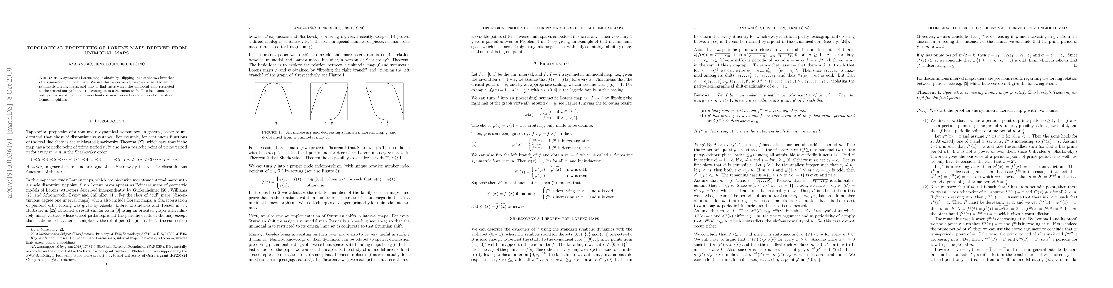 This paper explores the topological properties of Lorenz maps derived from symmetric unimodal maps by "flipping" one branch, leading to a Sharkovsky-like theorem and identifying cases where the unimodal map's critical omega-limit set is conjugate to a Sturmian shift, with implications for unimodal inverse limit spaces in planar homeomorphisms.