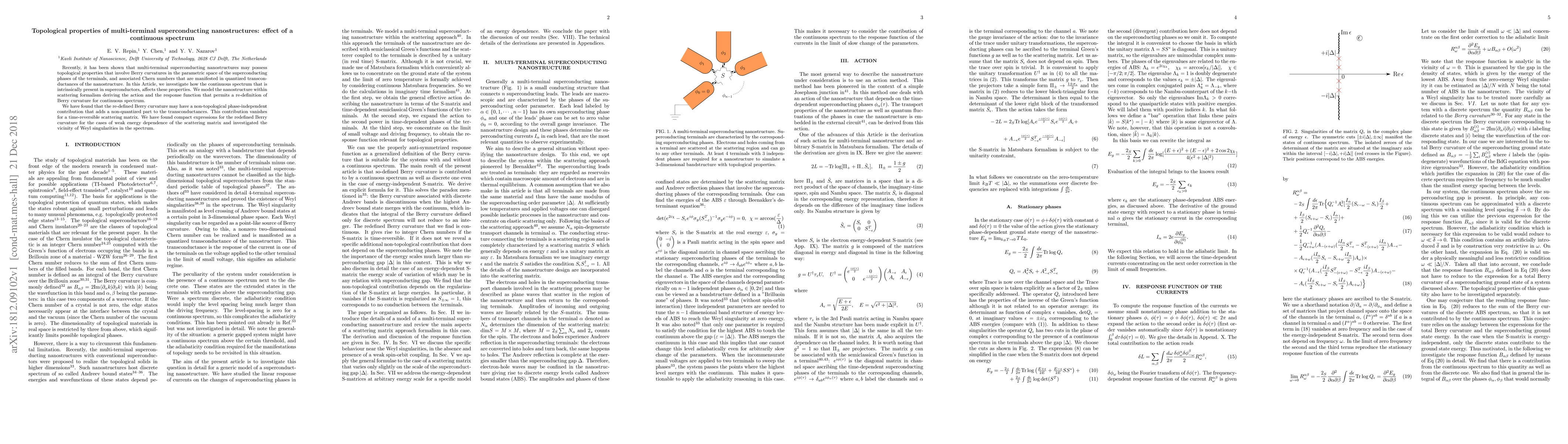 Recently, it has been shown that multi-terminal superconducting nanostructures may possess topological properties that involve Berry curvatures in the parametric space of the superconducting phases of the terminals, and associated Chern numbers that are manifested in quantized transconductances of the nanostructure. In this Article, we investigate how the continuous spectrum that is intrinsically present in superconductors, affects these properties. We model the nanostructure within scattering formalism deriving the action and the response function that permits a re-definition of Berry curvature for continuous spectrum. We have found that the re-defined Berry curvature may have a non-topological phase-independent contribution that adds a non-quantized part to the transconductances. This contribution vanishes for a time-reversible scattering matrix. We have found compact expressions for the redefined Berry curvature for the cases of weak energy dependence of the scattering matrix and investigated the vicinity of Weyl singularities in the spectrum.