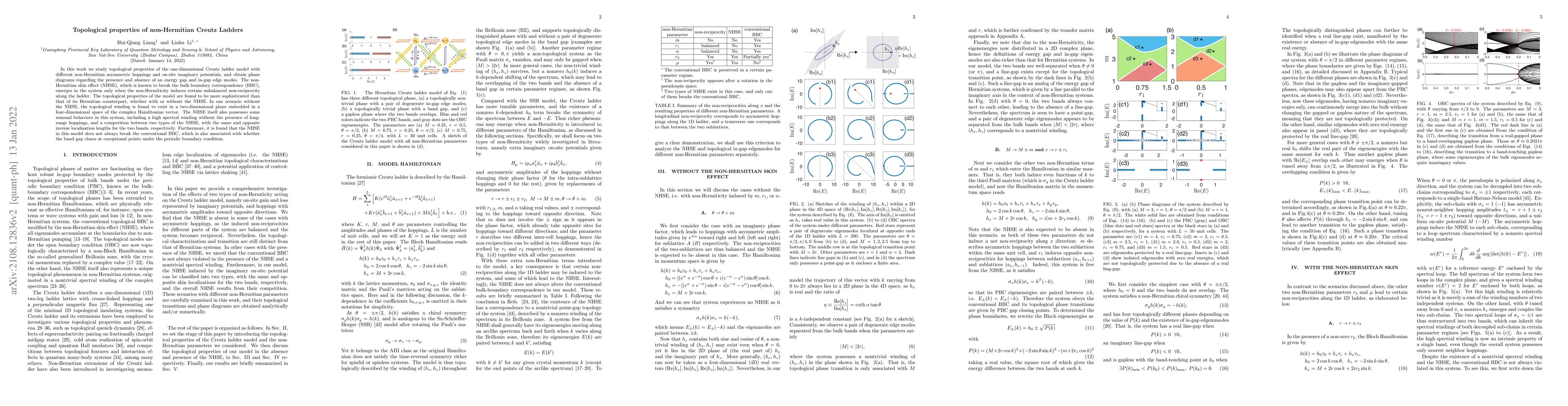 In this work we study topological properties of the one-dimensional Creutz ladder model with different non-Hermitian asymmetric hoppings and on-site imaginary potentials, and obtain phase diagrams regarding the presence and absence of an energy gap and in-gap edge modes. The non-Hermitian skin effect (NHSE), which is known to break the bulk-boundary correspondence (BBC), emerges in the system only when the non-Hermiticity induces certain unbalanced non-reciprocity along the ladder. The topological properties of the model are found to be more sophisticated than that of its Hermitian counterpart, whether with or without the NHSE. In one scenario without the NHSE, the topological winding is found to exist in a two-dimensional plane embedded in a four-dimensional space of the complex Hamiltonian vector. The NHSE itself also possesses some unusual behaviors in this system, including a high spectral winding without the presence of long-range hoppings, and a competition between two types of the NHSE, with the same and opposite inverse localization lengths for the two bands, respectively. Furthermore, it is found that the NHSE in this model does not always break the conventional BBC, which is also associated with whether the band gap closes at exceptional points under the periodic boundary condition.