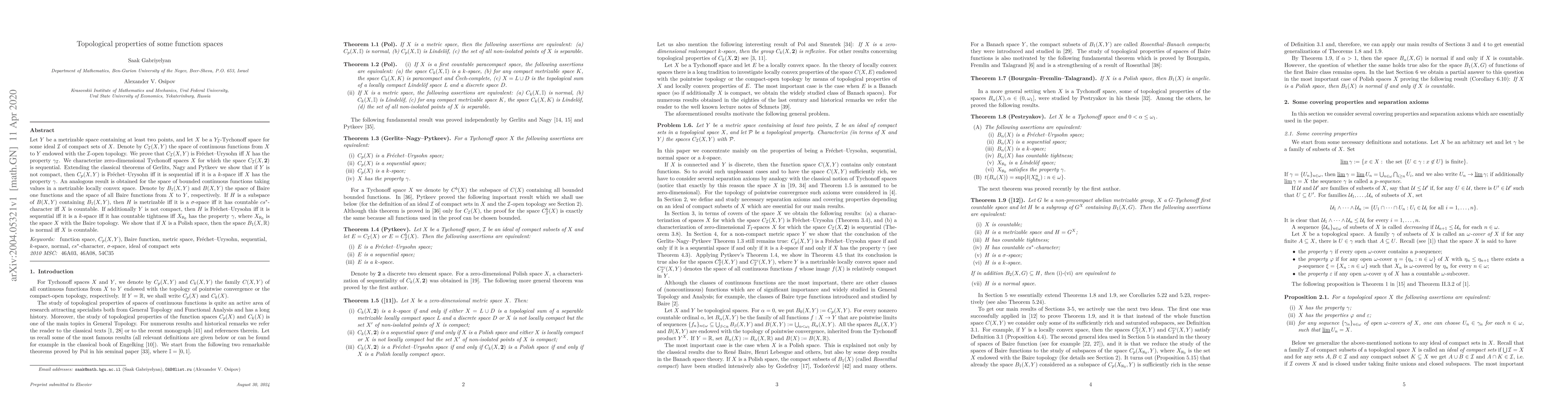 Let $Y$ be a metrizable space containing at least two points, and let $X$ be a $Y_{\mathcal{I}}$-Tychonoff space for some ideal $\mathcal{I}$ of compact sets of $X$. Denote by $C_{\mathcal{I}}(X,Y)$ the space of continuous functions from $X$ to $Y$ endowed with the $\mathcal{I}$-open topology. We prove that $C_{\mathcal{I}}(X,Y)$ is Fr\'{e}chet - Urysohn iff $X$ has the property $\gamma_{\mathcal{I}}$. We characterize zero - dimensional Tychonoff spaces $X$ for which the space $C_{\mathcal{I}}(X,{\bf 2})$ is sequential. Extending the classical theorems of Gerlits, Nagy and Pytkeev we show that if $Y$ is not compact, then $C_{p}(X,Y)$ is Fr\'{e}chet - Urysohn iff it is sequential iff it is a $k$-space iff $X$ has the property $\gamma$. An analogous result is obtained for the space of bounded continuous functions taking values in a metrizable locally convex space. Denote by $B_{1}(X,Y)$ and $B(X,Y)$ the space of Baire one functions and the space of all Baire functions from $X$ to $Y$, respectively. If $H$ is a subspace of $B(X,Y)$ containing $B_{1}(X,Y)$, then $H$ is metrizable iff it is a $\sigma$ - space iff it has countable $cs^*$ - character iff $X$ is countable. If additionally $Y$ is not compact, then $H$ is Fr\'{e}chet - Urysohn iff it is sequential iff it is a $k$ - space iff it has countable tightness iff $X_{\aleph_0}$ has the property $\gamma$, where $X_{\aleph_0}$ is the space $X$ with the Baire topology. We show that if $X$ is a Polish space, then the space $B_{1}(X,\mathbb{R})$ is normal iff $X$ is countable.