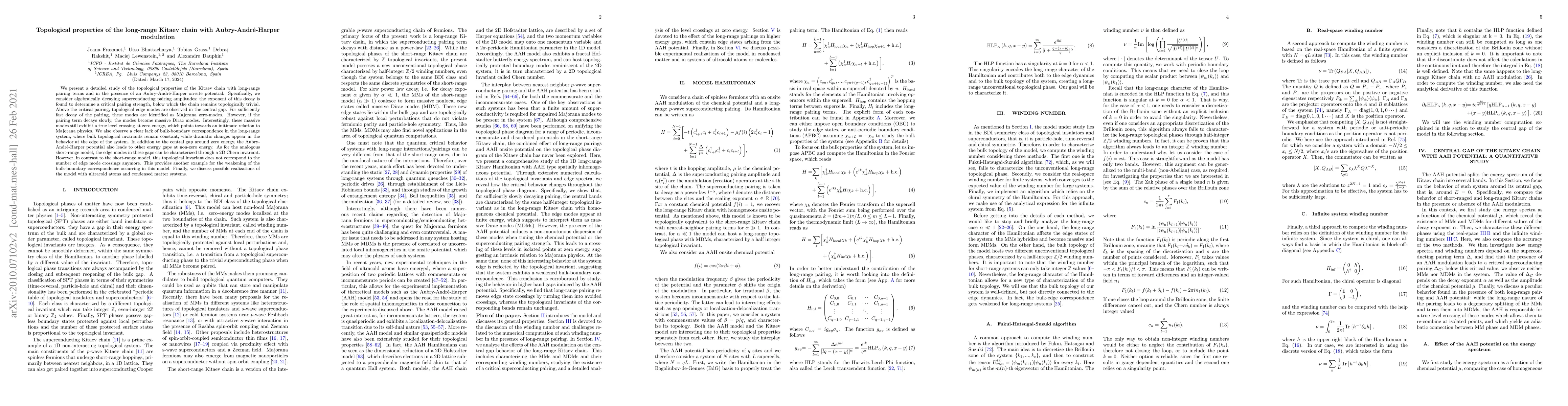 We present a detailed study of the topological properties of the Kitaev chain with long-range pairing terms and in the presence of an Aubry-Andr\'e-Harper on-site potential. Specifically, we consider algebraically decaying superconducting pairing amplitudes; the exponent of this decay is found to determine a critical pairing strength, below which the chain remains topologically trivial. Above the critical pairing, topological edge modes are observed in the central gap. For sufficiently fast decay of the pairing, these modes are identified as Majorana zero-modes. However, if the pairing term decays slowly, the modes become massive Dirac modes. Interestingly, these massive modes still exhibit a true level crossing at zero energy, which points towards an initimate relation to Majorana physics. We also observe a clear lack of bulk-boundary correspondence in the long-range system, where bulk topological invariants remain constant, while dramatic changes appear in the behavior at the edge of the system. In addition to the central gap around zero energy, the Aubry-Andr\'e-Harper potential also leads to other energy gaps at non-zero energy. As for the analogous short-range model, the edge modes in these gaps can be characterized through a 2D Chern invariant. However, in contrast to the short-range model, this topological invariant does not correspond to the number of edge mode crossings anymore. This provides another example for the weakening of the bulk-boundary correspondence occurring in this model. Finally, we discuss possible realizations of the model with ultracold atoms and condensed matter systems.