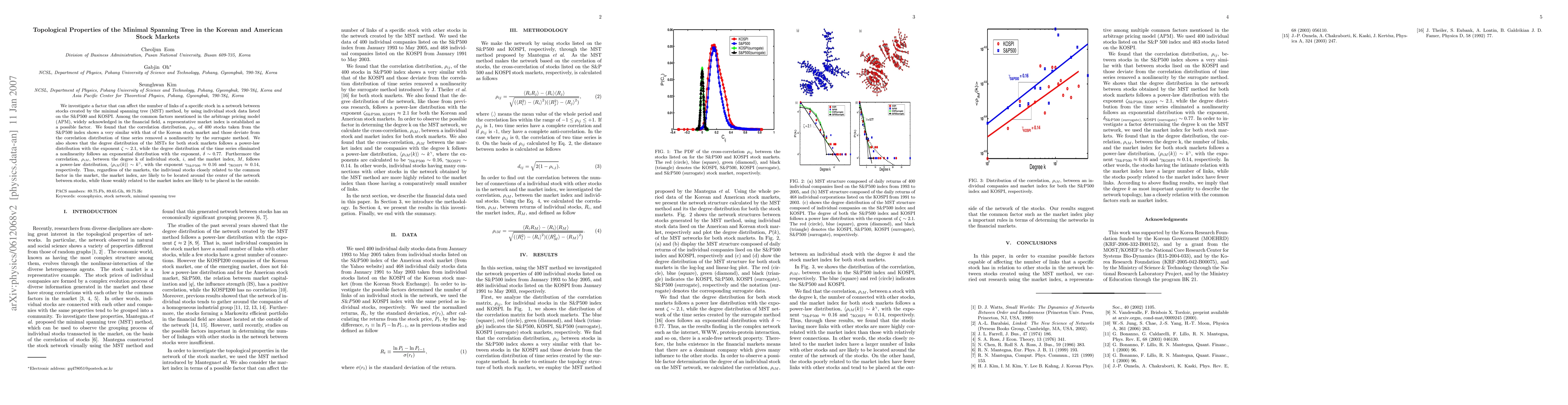 We investigate a factor that can affect the number of links of a specific stock in a network between stocks created by the minimal spanning tree (MST) method, by using individual stock data listed on the S&P500 and KOSPI. Among the common factors mentioned in the arbitrage pricing model (APM), widely acknowledged in the financial field, a representative market index is established as a possible factor. We found that the correlation distribution, $\rho_{ij}$, of 400 stocks taken from the S&P500 index shows a very similar with that of the Korean stock market and those deviate from the correlation distribution of time series removed a nonlinearity by the surrogate method. We also shows that the degree distribution of the MSTs for both stock markets follows a power-law distribution with the exponent $\zeta \sim$ 2.1, while the degree distribution of the time series eliminated a nonlinearity follows an exponential distribution with the exponent, $\delta \sim 0.77$. Furthermore the correlation, $\rho_{iM}$, between the degree k of individual stock, $i$, and the market index, $M$, follows a power-law distribution, $<\rho_{iM}(k) > \sim k^{\gamma}$, with the exponent $\gamma_{\textrm{S&P500}} \approx 0.16$ and $\gamma_{\textrm{KOSPI}} \approx 0.14$, respectively. Thus, regardless of the markets, the indivisual stocks closely related to the common factor in the market, the market index, are likely to be located around the center of the network between stocks, while those weakly related to the market index are likely to be placed in the outside.