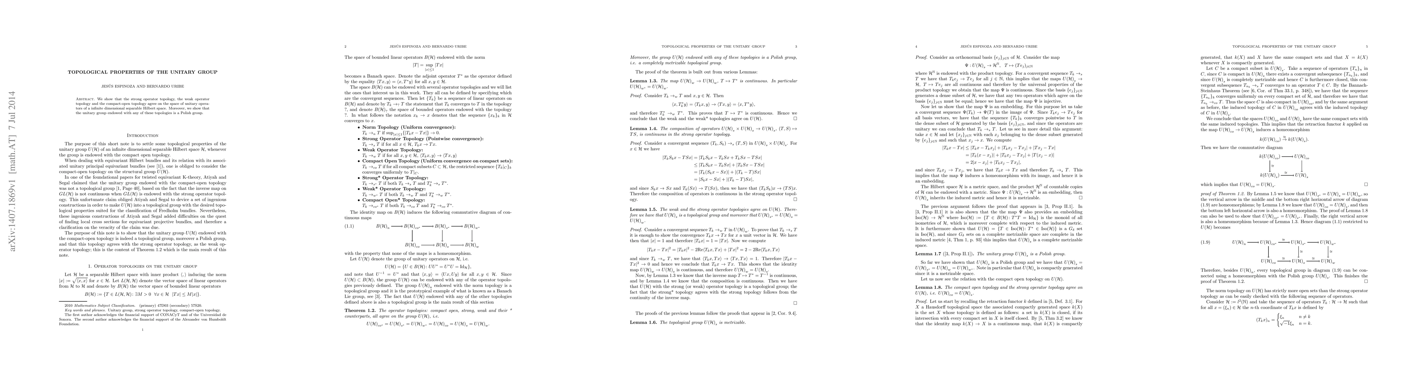 Researchers prove that three topological spaces - strong operator topology, weak operator topology, and compact-open topology - converge to the same properties in infinite-dimensional unitary operators, making the group a Polish space.