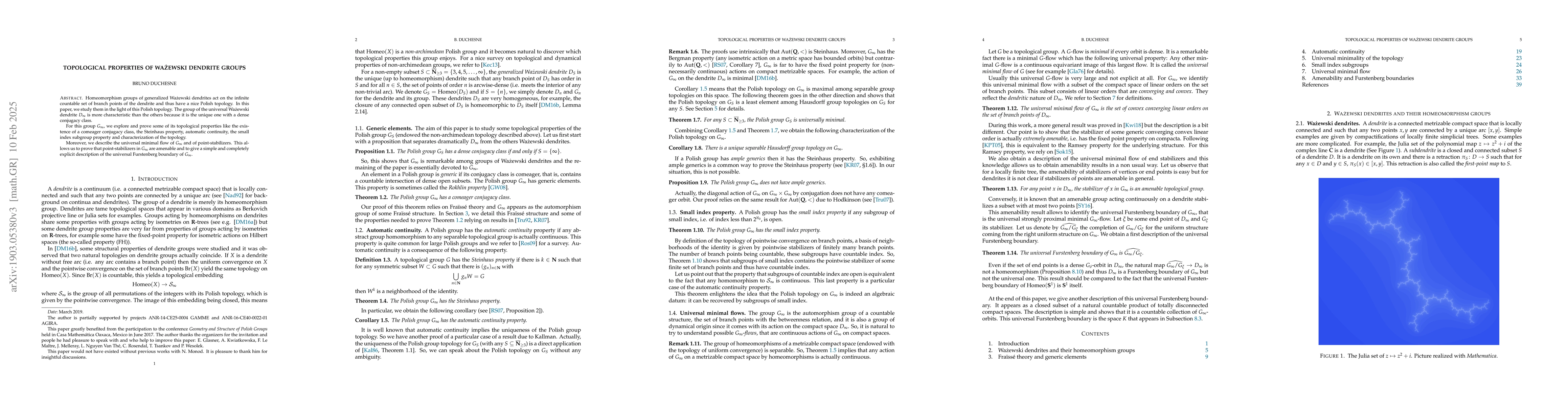 This paper investigates the topological properties of homeomorphism groups of generalized Waźewski dendrites, focusing on the group of the universal Waźewski dendrite $D_\infty$. It highlights $G_\infty$'s unique features, such as a dense conjugacy class, and examines its topological characteristics, including comeager conjugacy classes, the Steinhaus property, automatic continuity, and small index subgroup properties.
