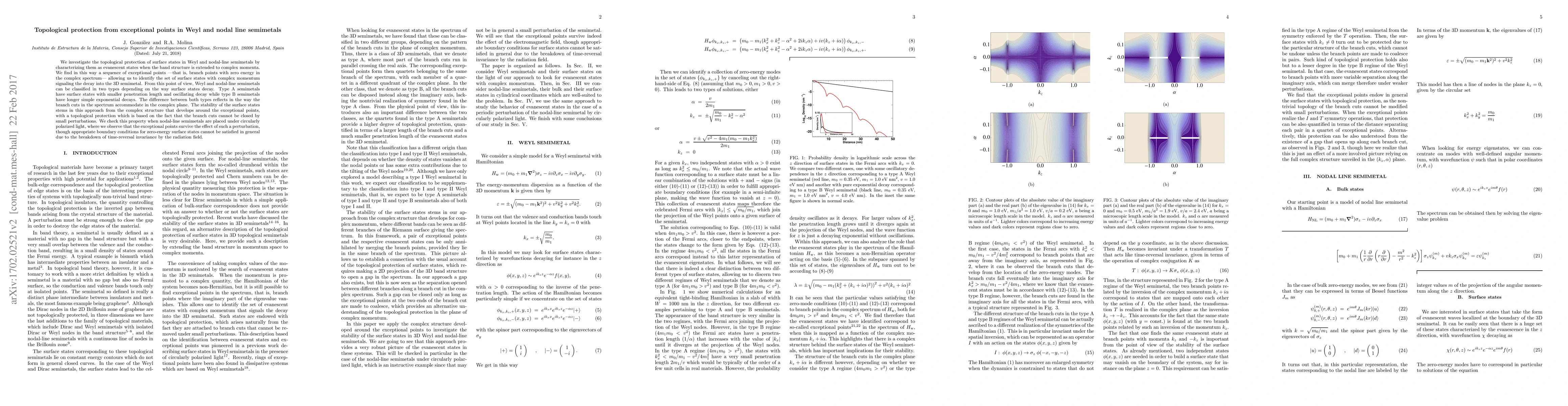 We investigate the topological protection of surface states in Weyl and nodal-line semimetals by characterizing them as evanescent states when the band structure is extended to complex momenta. We find in this way a sequence of exceptional points -that is, branch points with zero energy in the complex spectrum- allowing us to identify the set of surface states with complex momentum signaling the decay into the 3D semimetal. From this point of view, Weyl and nodal-line semimetals can be classified in two types depending on the way surface states decay. Type A semimetals have surface states with smaller penetration length and oscillating decay while type B semimetals have longer simple exponential decays. The difference between both types reflects in the way the branch cuts in the spectrum accommodate in the complex plane. The stability of the surface states stems in this approach from the complex structure that develops around the exceptional points, with a topological protection which is based on the fact that the branch cuts cannot be closed by small perturbations. We check this property when nodal-line semimetals are placed under circularly polarized light, where we observe that the exceptional points survive the effect of such a perturbation, though appropriate boundary conditions for zero-energy surface states cannot be satisfied in general due to the breakdown of time-reversal invariance by the radiation field.
