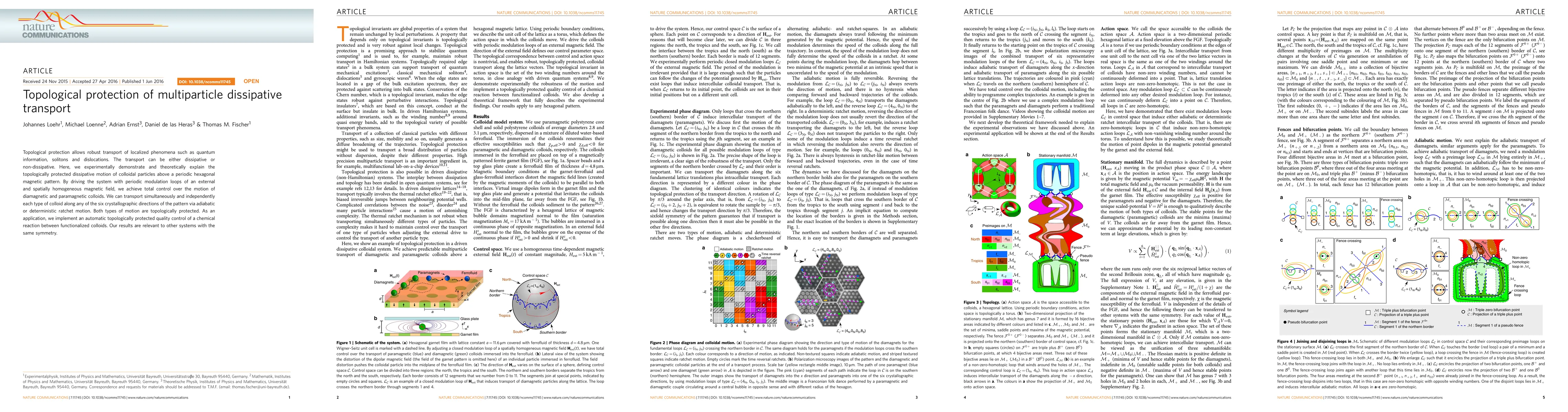 This paper demonstrates the topologically protected dissipative transport of colloidal particles using a periodic hexagonal magnetic pattern, achieving independent control over diamagnetic and paramagnetic colloids. The study highlights the robustness of this transport mechanism and its potential application in automated quality control of chemical reactions.