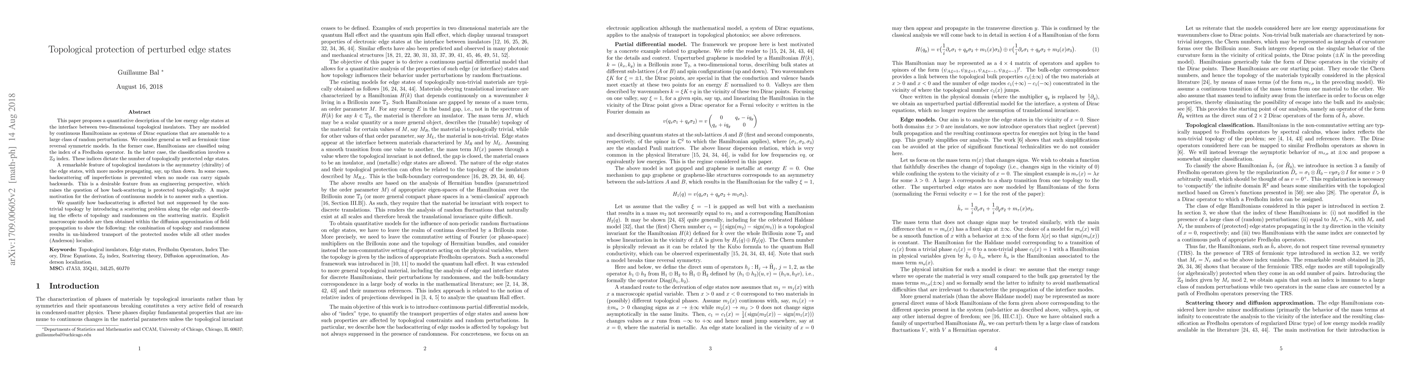 This paper proposes a quantitative description of the low energy edge states at the interface between two-dimensional topological insulators. They are modeled by continuous Hamiltonians as systems of Dirac equations that are amenable to a large class of random perturbations. We consider general as well as fermionic time reversal symmetric models. In the former case, Hamiltonians are classified using the index of a Fredholm operator. In the latter case, the classification involves a ${\mathbb Z}_2$ index. These indices dictate the number of topologically protected edge states. A remarkable feature of topological insulators is the asymmetry (chirality) of the edge states, with more modes propagating, say, up than down. In some cases, backscattering off imperfections is prevented when no mode can carry signals backwards. This is a desirable feature from an engineering perspective, which raises the question of how back-scattering is protected topologically. A major motivation for the derivation of continuous models is to answer such a question. We quantify how backscattering is affected but not suppressed by the non-trivial topology by introducing a scattering problem along the edge and describing the effects of topology and randomness on the scattering matrix. Explicit macroscopic models are then obtained within the diffusion approximation of field propagation to show the following: the combination of topology and randomness results in un-hindered transport of the protected modes while all other modes (Anderson) localize.