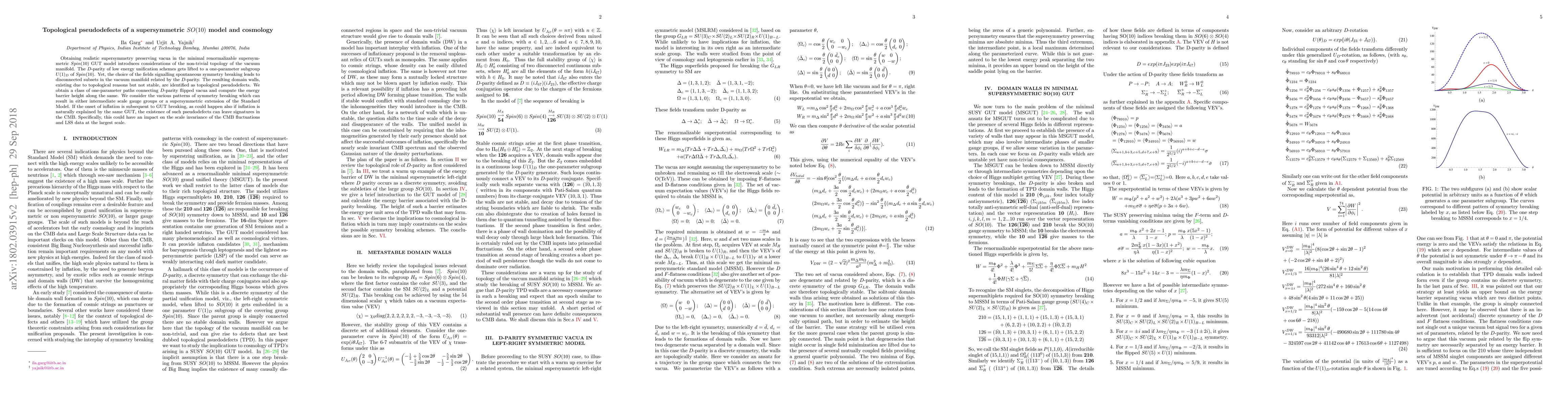 Obtaining realistic supersymmetry preserving vacua in the minimal renormalizable supersymmetric $Spin(10)$ GUT model introduces considerations of the non-trivial topology of the vacuum manifold. The $D$-parity of low energy unification schemes gets lifted to a one-parameter subgroup $U(1)_D$ of $Spin(10)$. Yet, the choice of the fields signaling spontaneous symmetry breaking leads to disconnected subsets in the vacuum manifold related by the $D$-parity. The resulting domain walls, existing due to topological reasons but not stable, are identified as topological pseudodefects. We obtain a class of one-parameter paths connecting $D$-parity flipped vacua and compute the energy barrier height along the same. We consider the various patterns of symmetry breaking which can result in either intermediate scale gauge groups or a supersymmetric extension of the Standard Model. If the onset of inflation is subsequent to GUT breaking, as could happen also if inflation is naturally explained by the same GUT, the existence of such pseudodefects can leave signatures in the CMB. Specifically, this could have an impact on the scale invariance of the CMB fluctuations and LSS data at the largest scale.