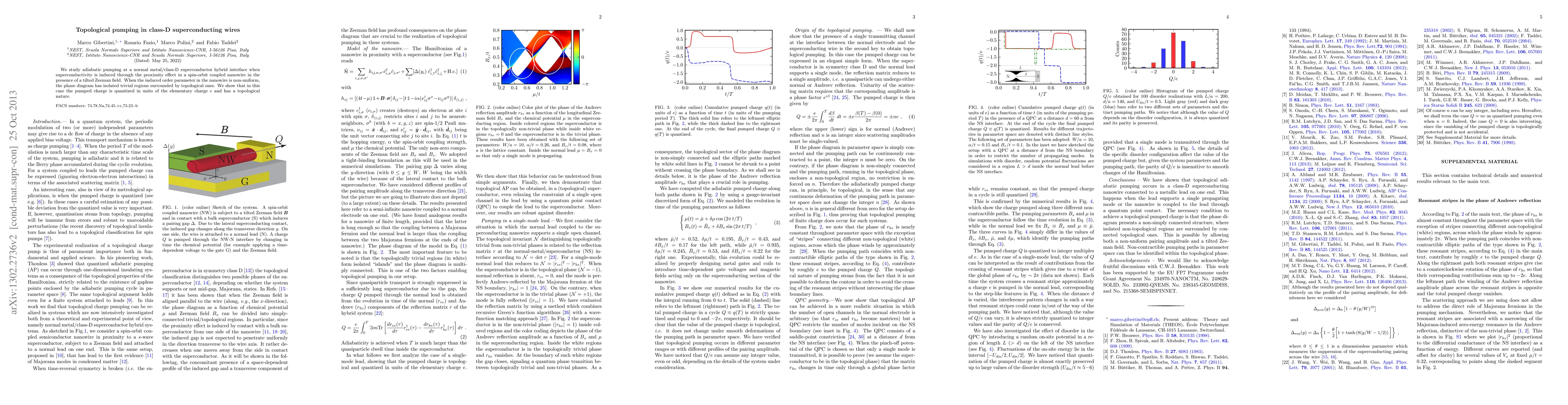 This paper investigates adiabatic pumping at a normal metal/class-D superconductor interface, revealing quantized topological pumping in spin-orbit coupled nanowires under a tilted Zeeman field. The study finds that non-uniform superconductivity induces topological regions, leading to charge pumping quantized in units of the elementary charge $e$.