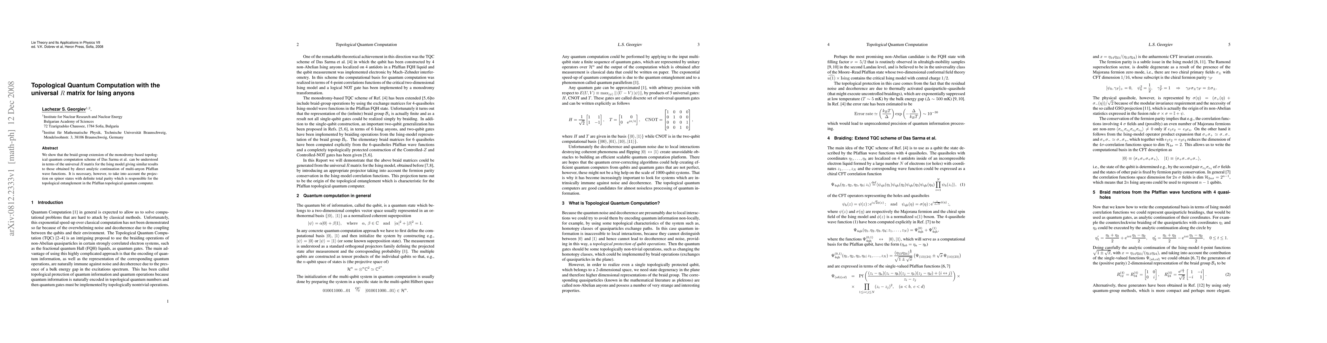 We show that the braid-group extension of the monodromy-based topological quantum computation scheme of Das Sarma et al. can be understood in terms of the universal R matrix for the Ising model giving similar results to those obtained by direct analytic continuation of multi-anyon Pfaffian wave functions. It is necessary, however, to take into account the projection on spinor states with definite total parity which is responsible for the topological entanglement in the Pfaffian topological quantum computer.