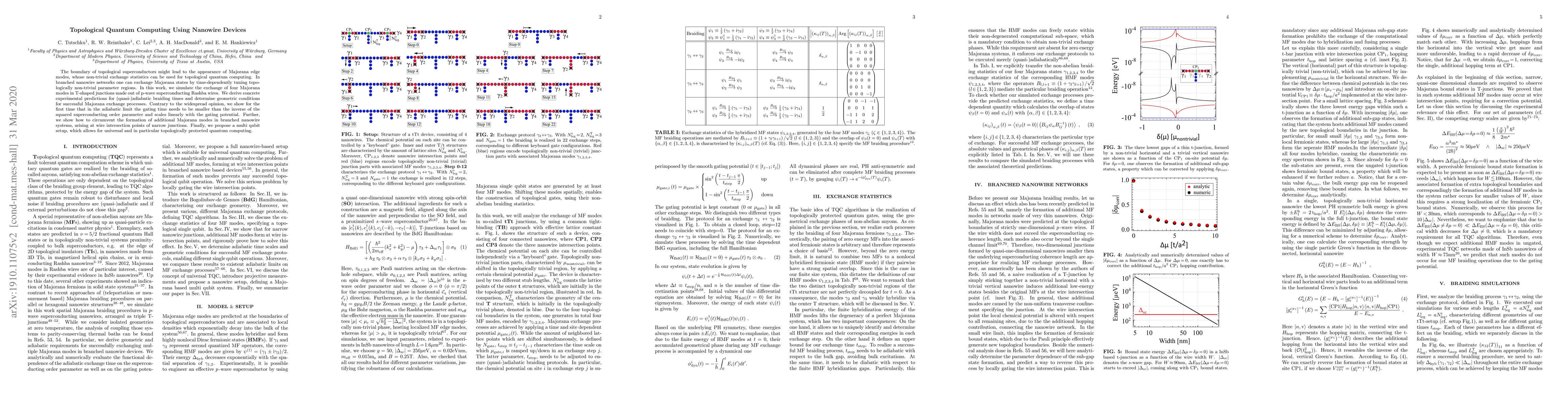 This paper explores topological quantum computing using Majorana edge modes in p-wave superconducting Rashba nanowires. It simulates the exchange of four Majorana modes in T-shaped junctions, providing predictions for braiding times and conditions for successful exchanges, and proposes a multi-qubit setup for universal quantum computing.