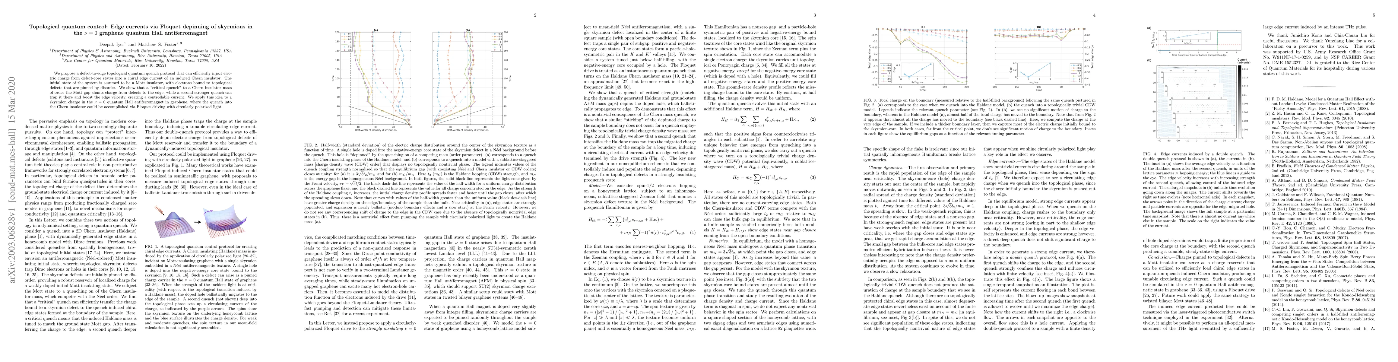 This paper proposes a topological quantum control method to inject electric charge into a chiral edge current in a graphene quantum Hall antiferromagnet by using a "critical quench" and a subsequent stronger quench to depin skyrmions via Floquet driving with circularly polarized light. This method aims to create a controllable current by transitioning from a Mott insulator state to a Chern insulator state.