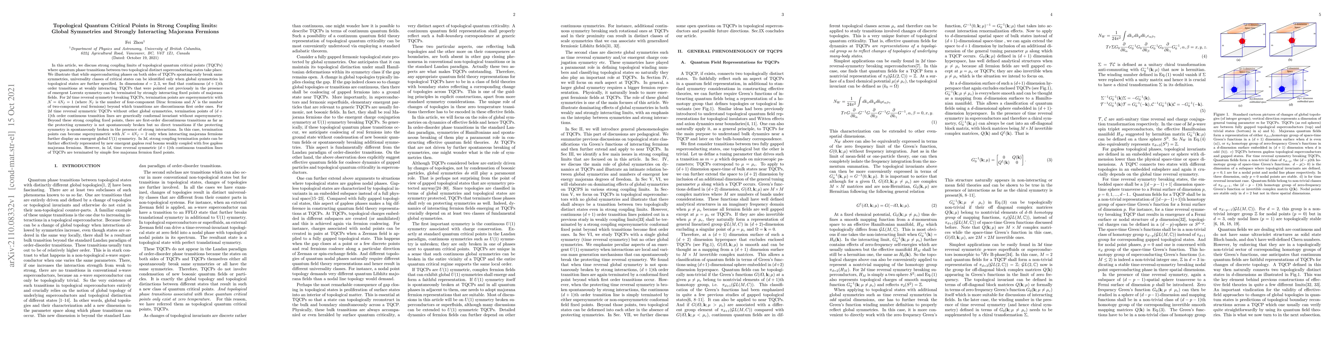This paper explores strong coupling limits of topological quantum critical points (TQCPs) where superconducting phases transition between topologically distinct states. It identifies universality classes of critical states through specified global symmetries and finds that strongly interacting Majorana fermions terminate continuous transitions in 2D and 3D, leading to first-order transitions when symmetries are broken.