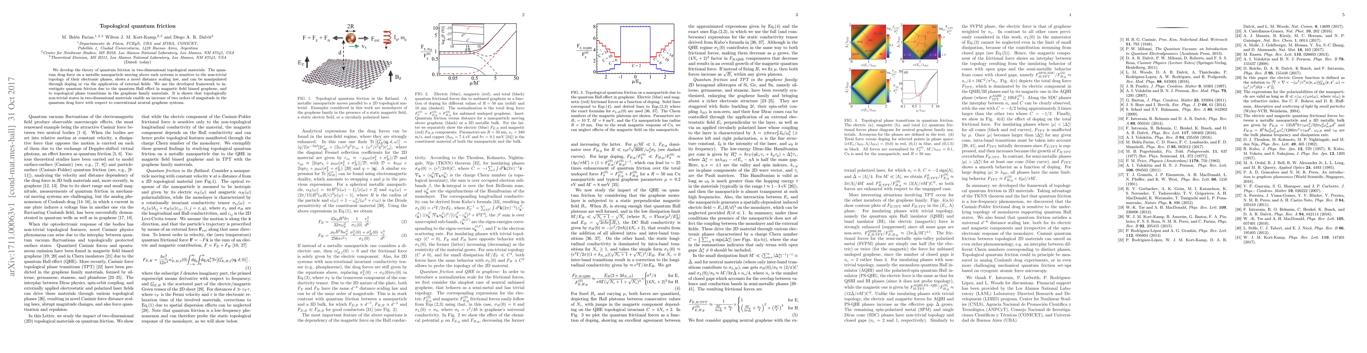 The paper develops a theory for quantum friction in topological materials, revealing that non-trivial topology enhances the quantum drag force on nanoparticles, which can be controlled by doping or external fields, leading to significant increases in drag force compared to conventional graphene.