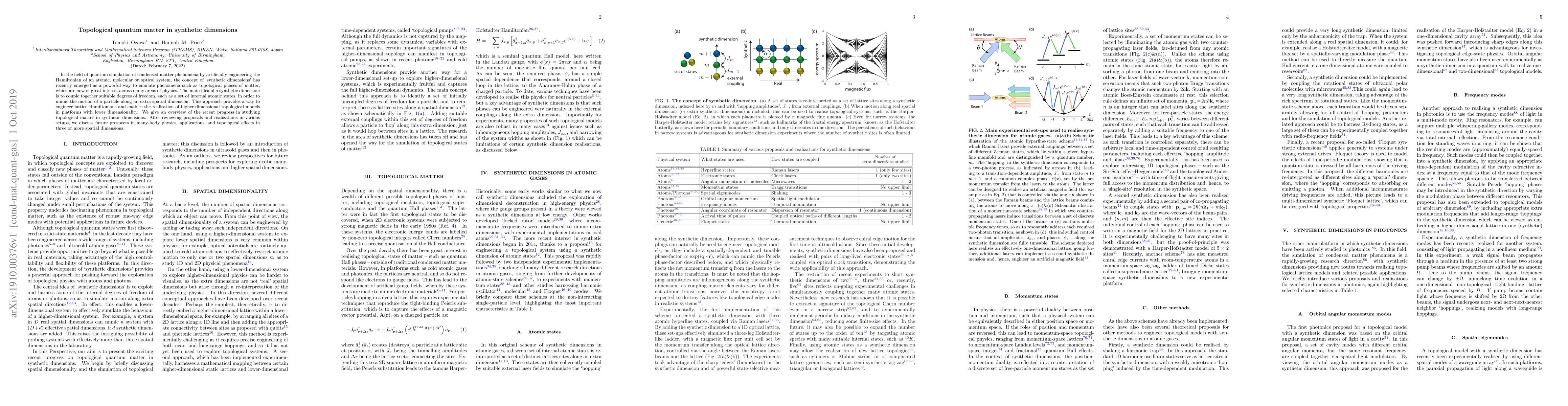 The paper provides an overview of recent progress in studying topological matter in synthetic dimensions, reviewing proposals and realizations in various setups, and discussing future prospects in many-body physics, applications, and topological effects in three or more spatial dimensions.