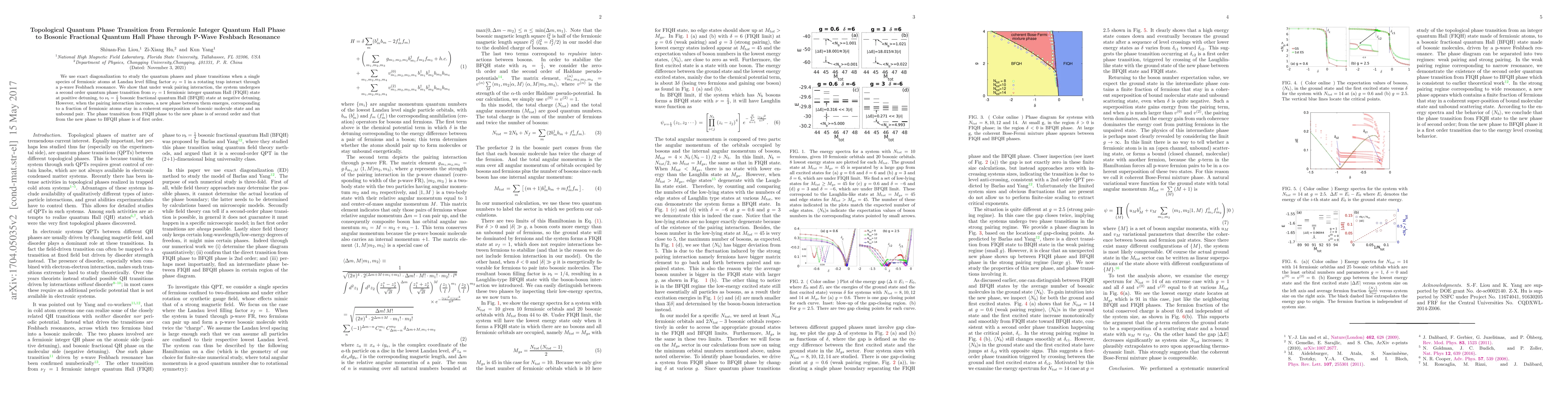 We use exact diagonalization to study the quantum phases and phase transitions when a single species of fermionic atoms at Landau level filling factor $\nu_f = 1$ in a rotating trap interact through a p-wave Feshbach resonance. We show that under weak pairing interaction, the system undergoes a second order quantum phase transition from $\nu_{f} = 1$ fermionic integer quantum Hall (FIQH) state at positive detuning, to $\nu_{b} = \frac{1}{4}$ bosonic fractional quantum Hall (BFQH) state at negative detuning. However, when the pairing interaction increases, a new phase between them emerges, corresponding to a fraction of fermionic atoms stay in a coherent superposition of bosonic molecule state and an unbound pair. The phase transition from FIQH phase to the new phase is of second order and that from the new phase to BFQH phase is of first order.