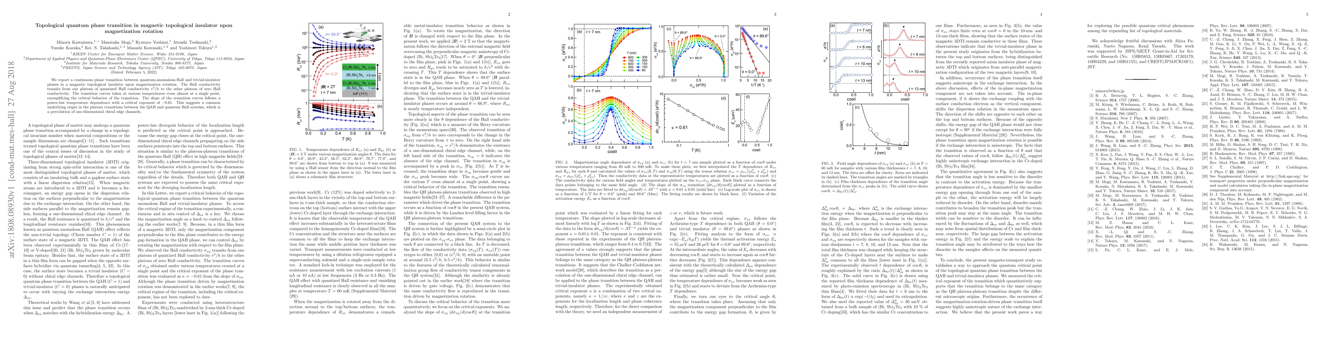 This study reveals a continuous topological phase transition in a magnetic topological insulator, transitioning between quantum-anomalous-Hall and trivial-insulator phases with magnetization rotation. The transition exhibits critical behavior, with a power-law temperature dependence and a critical exponent of $-0.61$, indicating a shared origin in the percolation of chiral edge channels.