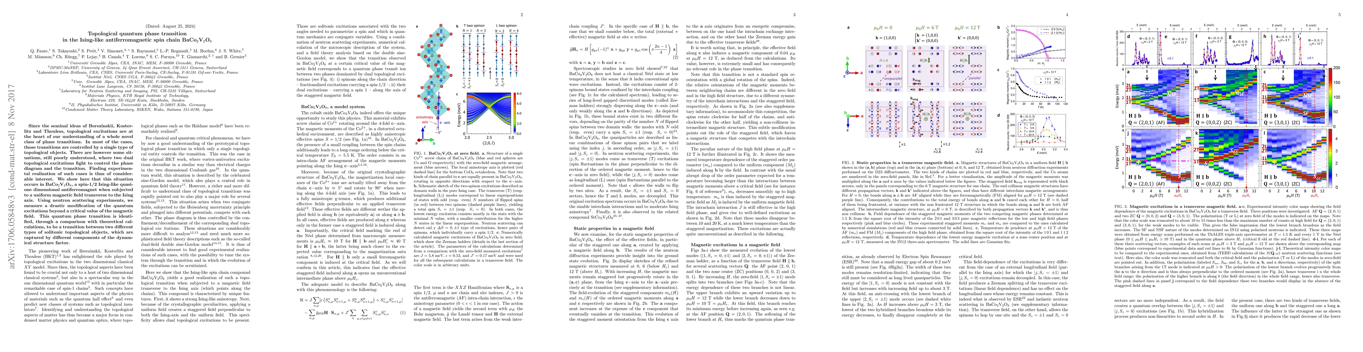 Since the seminal ideas of Berezinskii, Kosterlitz and Thouless, topological excitations are at the heart of our understanding of a whole novel class of phase transitions. In most of the cases, those transitions are controlled by a single type of topological objects. There are however some situations, still poorly understood, where two dual topological excitations fight to control the phase diagram and the transition. Finding experimental realization of such cases is thus of considerable interest. We show here that this situation occurs in BaCo$_2$V$_2$O$_8$, a spin-1/2 Ising-like quasi-one dimensional antiferromagnet when subjected to a uniform magnetic field transverse to the Ising axis. Using neutron scattering experiments, we measure a drastic modification of the quantum excitations beyond a critical value of the magnetic field. This quantum phase transition is identified, through a comparison with theoretical calculations, to be a transition between two different types of solitonic topological objects, which are captured by different components of the dynamical structure factor.