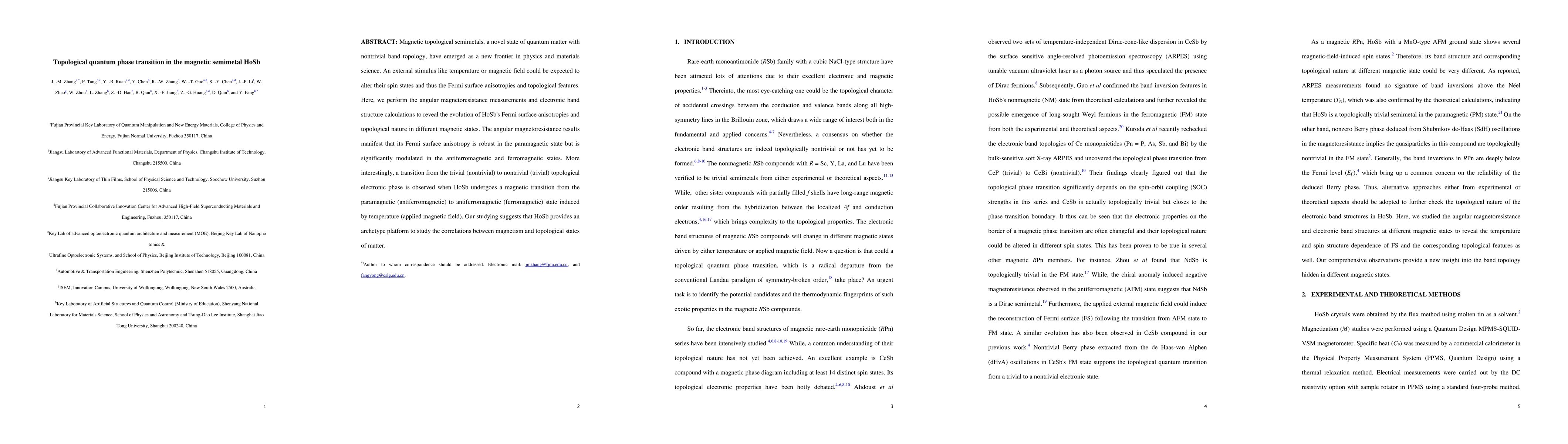 Magnetic topological semimetals, a novel state of quantum matter with nontrivial band topology, have emerged as a new frontier in physics and materials science. An external stimulus like temperature or magnetic field could be expected to alter their spin states and thus the Fermi surface anisotropies and topological features. Here, we perform the angular magnetoresistance measurements and electronic band structure calculations to reveal the evolution of HoSb's Fermi surface anisotropies and topological nature in different magnetic states. The angular magnetoresistance results manifest that its Fermi surface anisotropy is robust in the paramagnetic state but is significantly modulated in the antiferromagnetic and ferromagnetic states. More interestingly, a transition from the trivial (nontrivial) to nontrivial (trivial) topological electronic phase is observed when HoSb undergoes a magnetic transition from the paramagnetic (antiferromagnetic) to antiferromagnetic (ferromagnetic) state induced by temperature (applied magnetic field). Our studying suggests that HoSb provides an archetype platform to study the correlations between magnetism and topological states of matter.