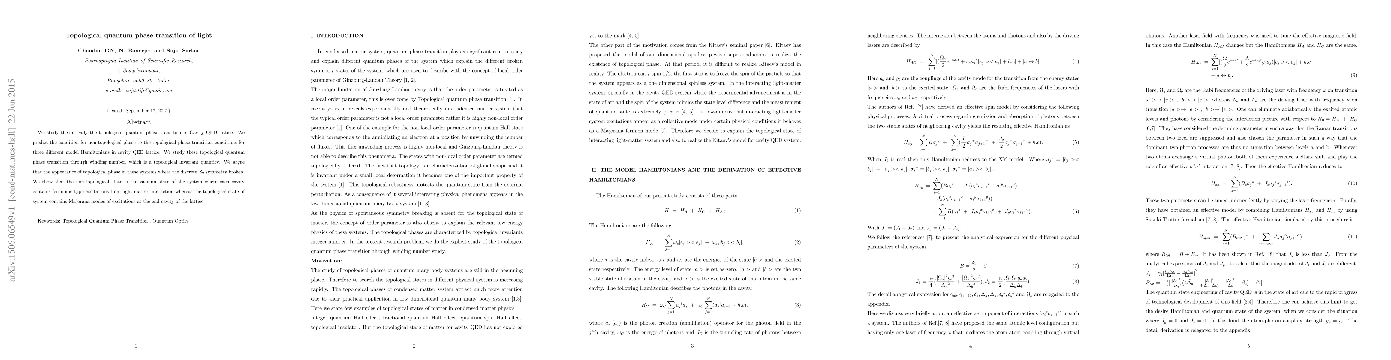 This research investigates the topological quantum phase transition in a Cavity QED lattice, predicting transition conditions for three Hamiltonian models. It uses the winding number to study these transitions, arguing that the appearance of topological phases occurs when discrete Z₂ symmetry is broken, resulting in Majorana modes in the topological state.