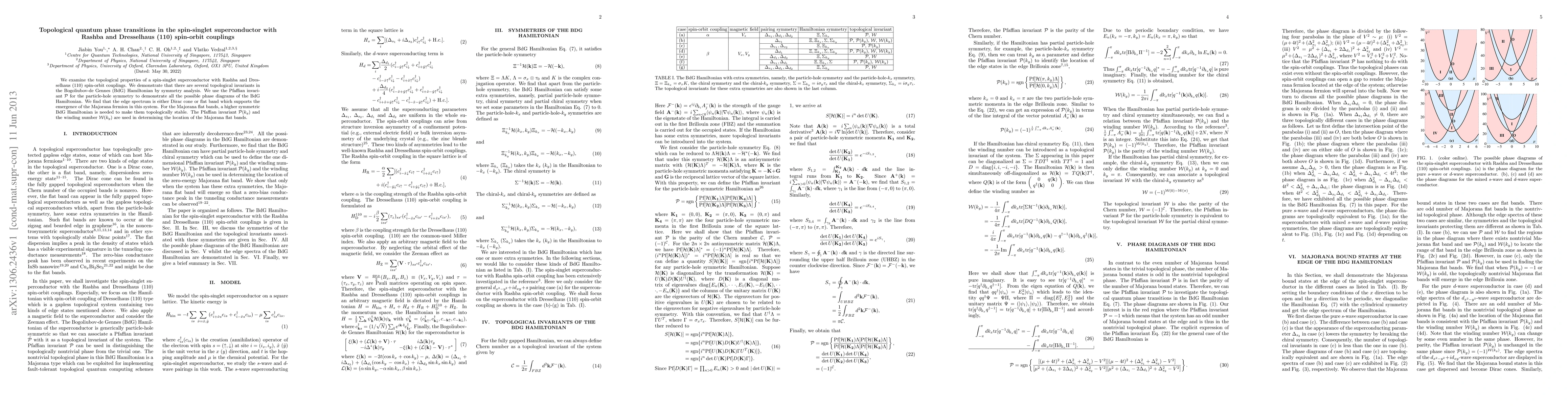 This paper explores topological quantum phase transitions in spin-singlet superconductors with Rashba and Dresselhaus spin-orbit couplings, revealing multiple topological invariants and demonstrating the emergence of Majorana fermions through edge spectra analysis. The Pfaffian invariant and winding number are used to determine the stability and location of Majorana flat bands.