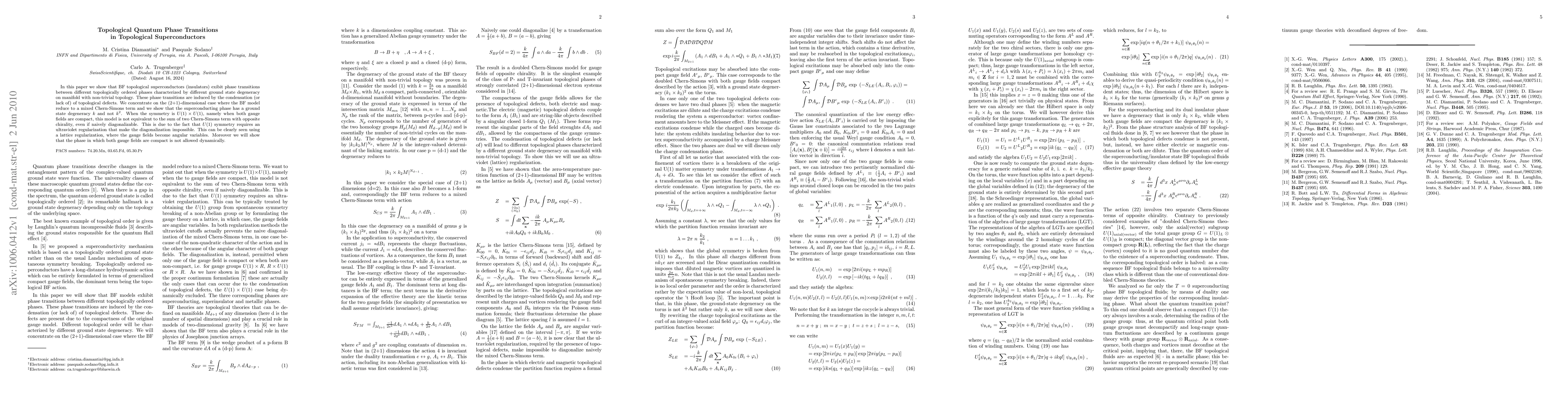 This paper investigates topological quantum phase transitions in (2+1)-dimensional BF topological superconductors, revealing distinct topologically ordered phases with different ground state degeneracies induced by the condensation of topological defects. It highlights that the superconducting phase has a ground state degeneracy $k$ rather than $k^2$, and discusses the non-equivalence of the model under $U(1) \times U(1)$ symmetry due to ultraviolet regularization issues.